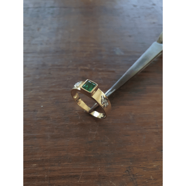 A peça é adornada com uma pedra central no corte carré, medindo 5mm x 5mm, que traz brilho e imponência ao conjunto. Essa lapidação sofisticada valoriza a luz natural, conferindo à joia um charme singular.