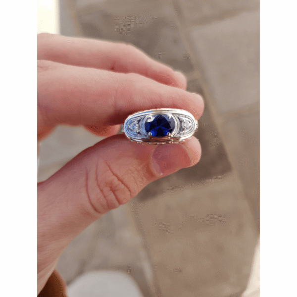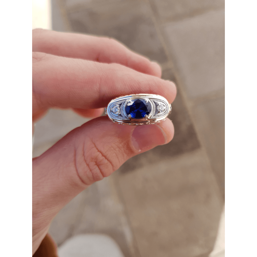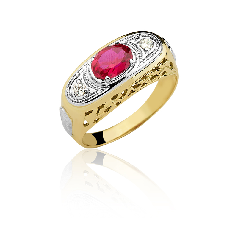 Pedra central: Rubi sintético (oval) 6mm por 8mm.