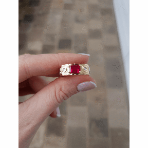 Pedra central: Rubi sintético (octogonal) com 5mm por 7mm.