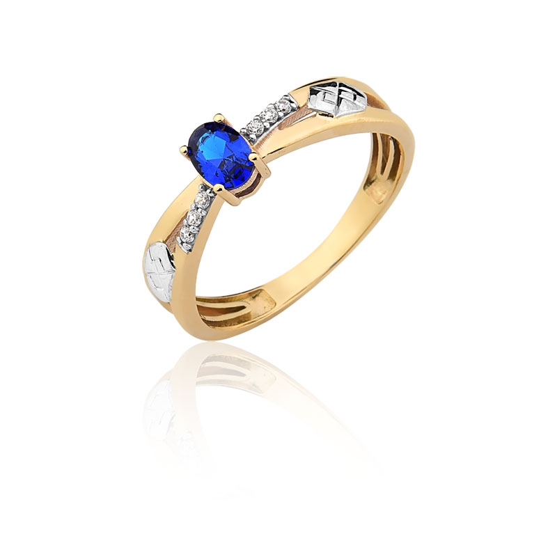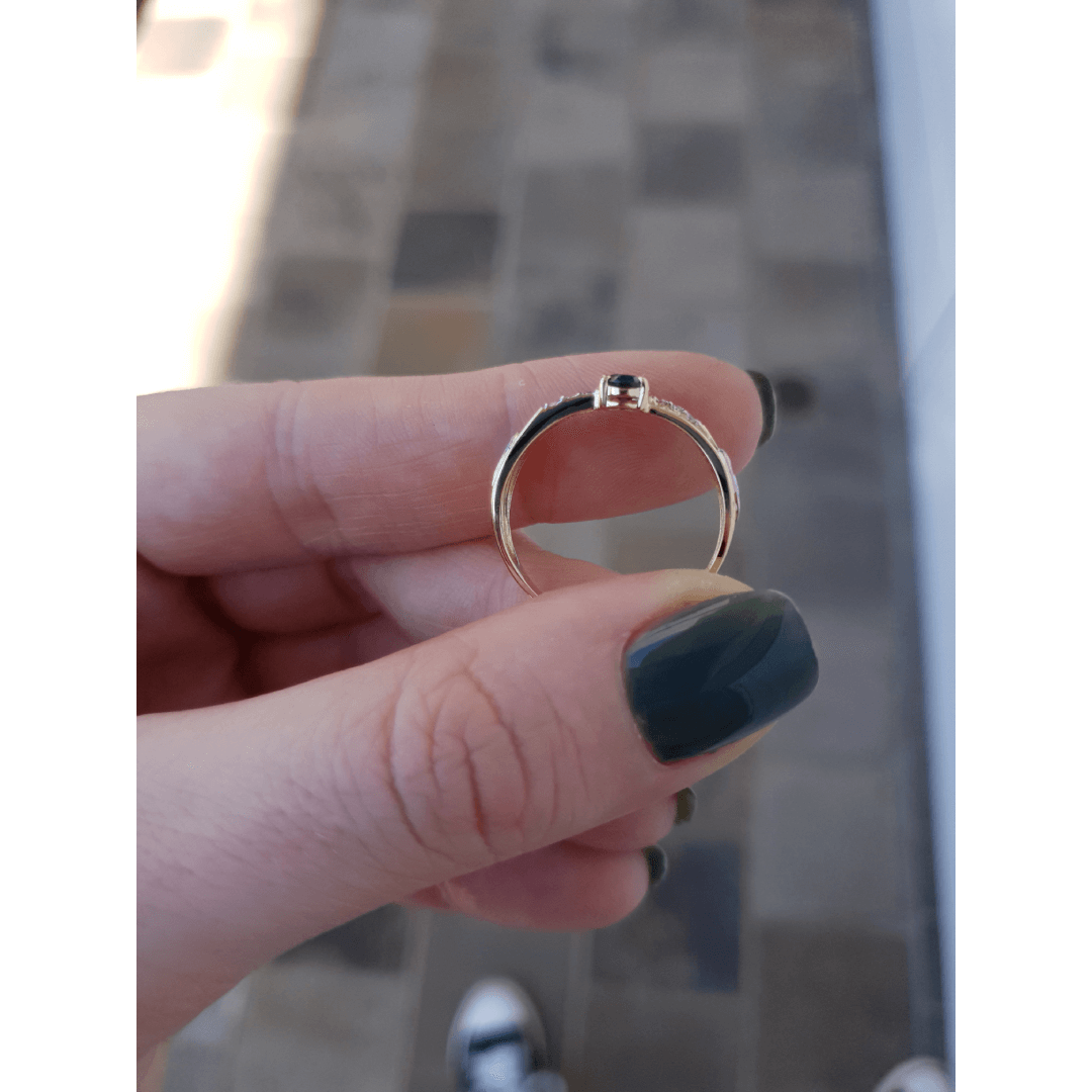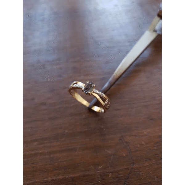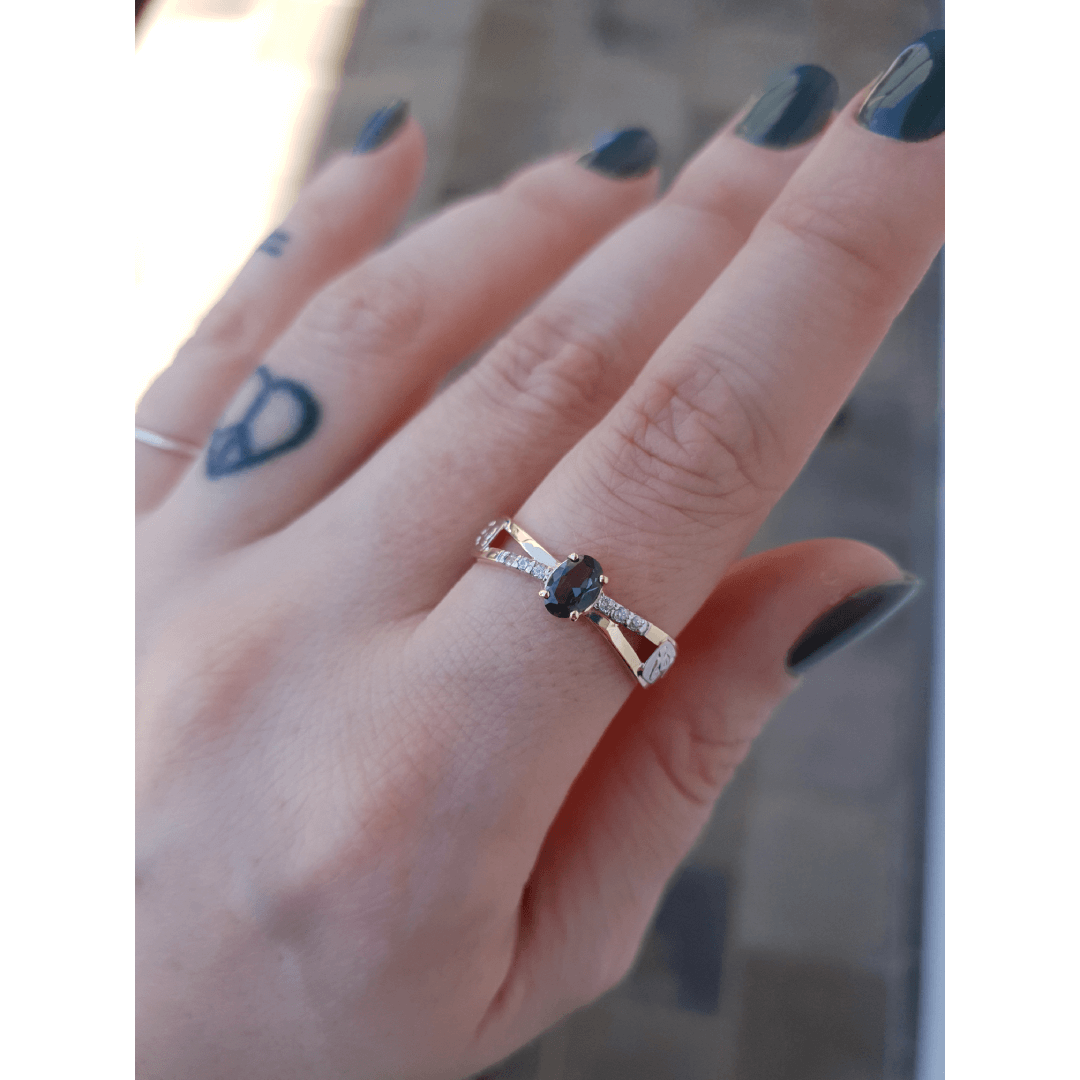 Pedra central: Safira azul com 4mm por 6mm.
