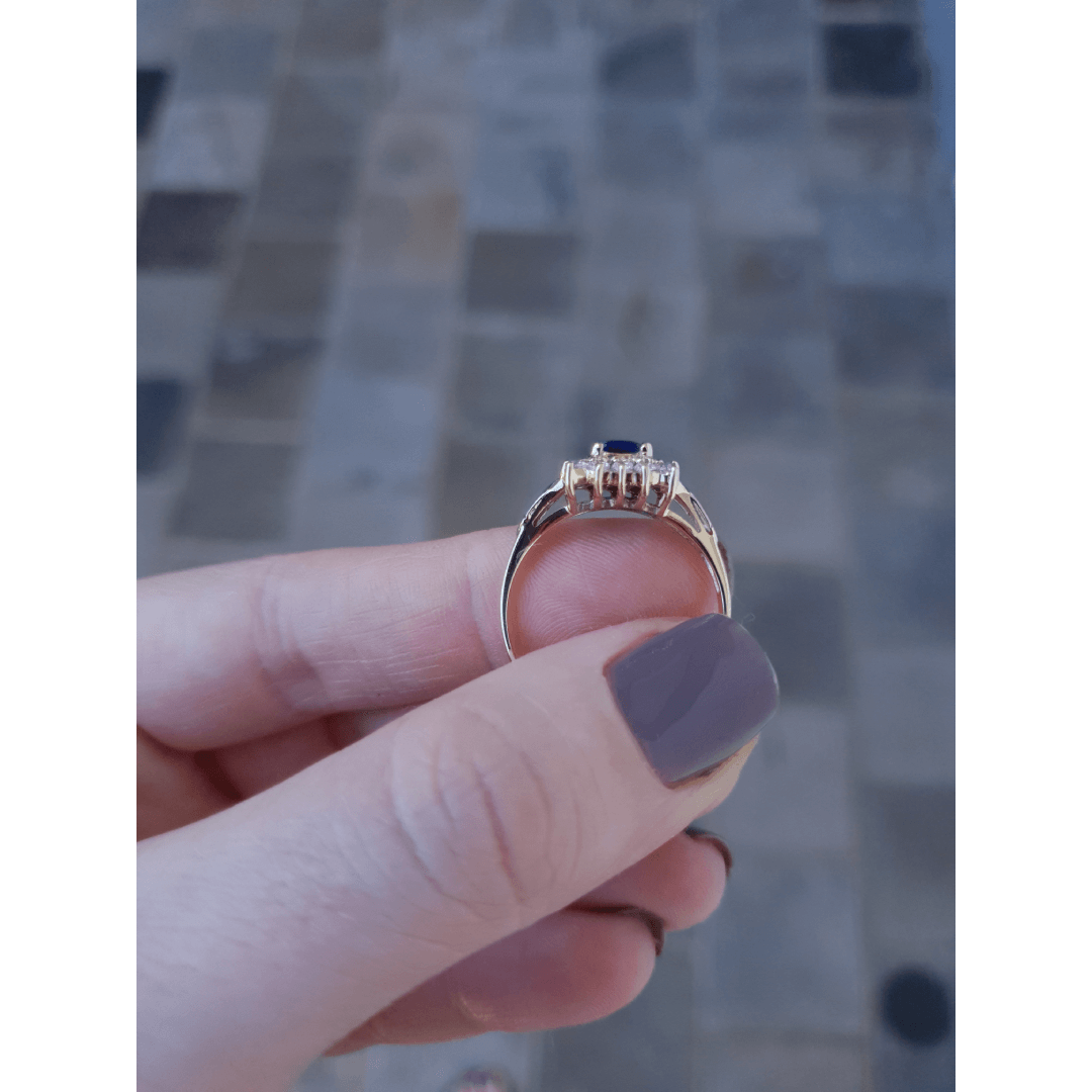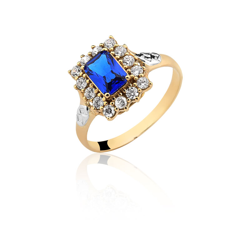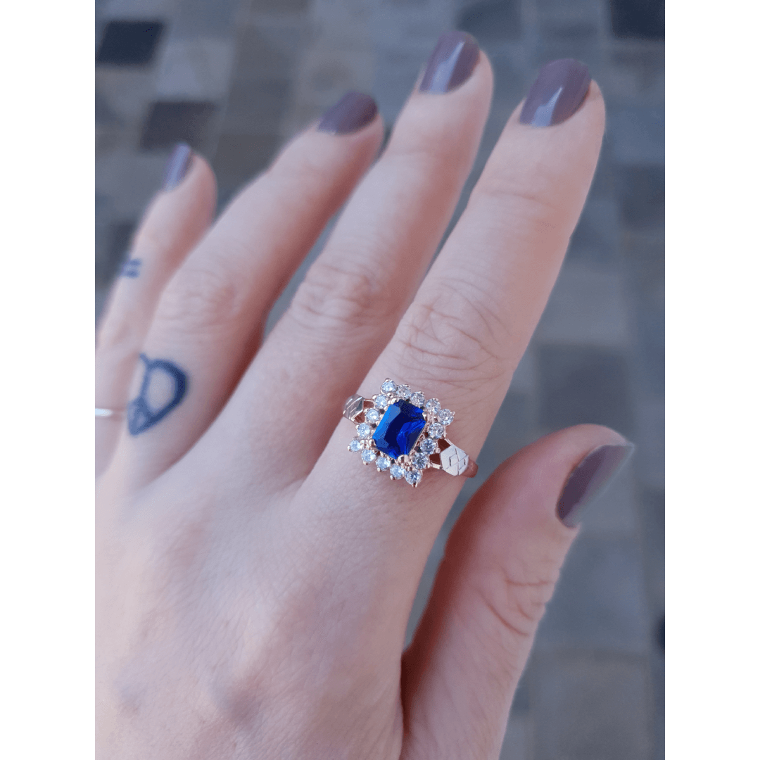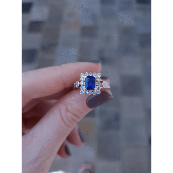 Pedra central: Safira Azul sintética octogonal com 5mm por 7mm.