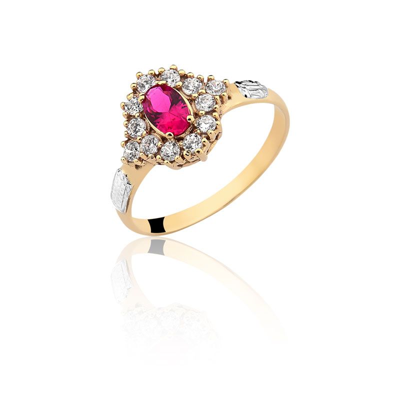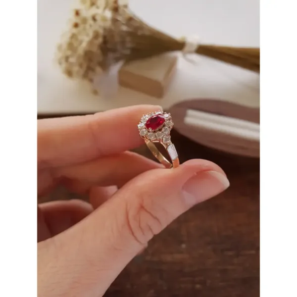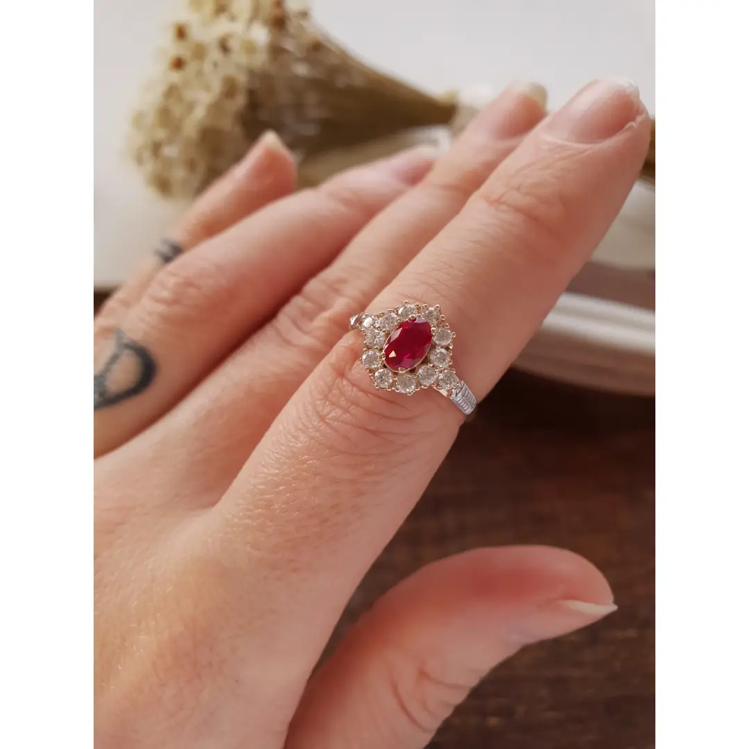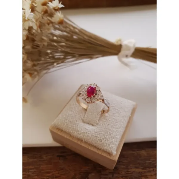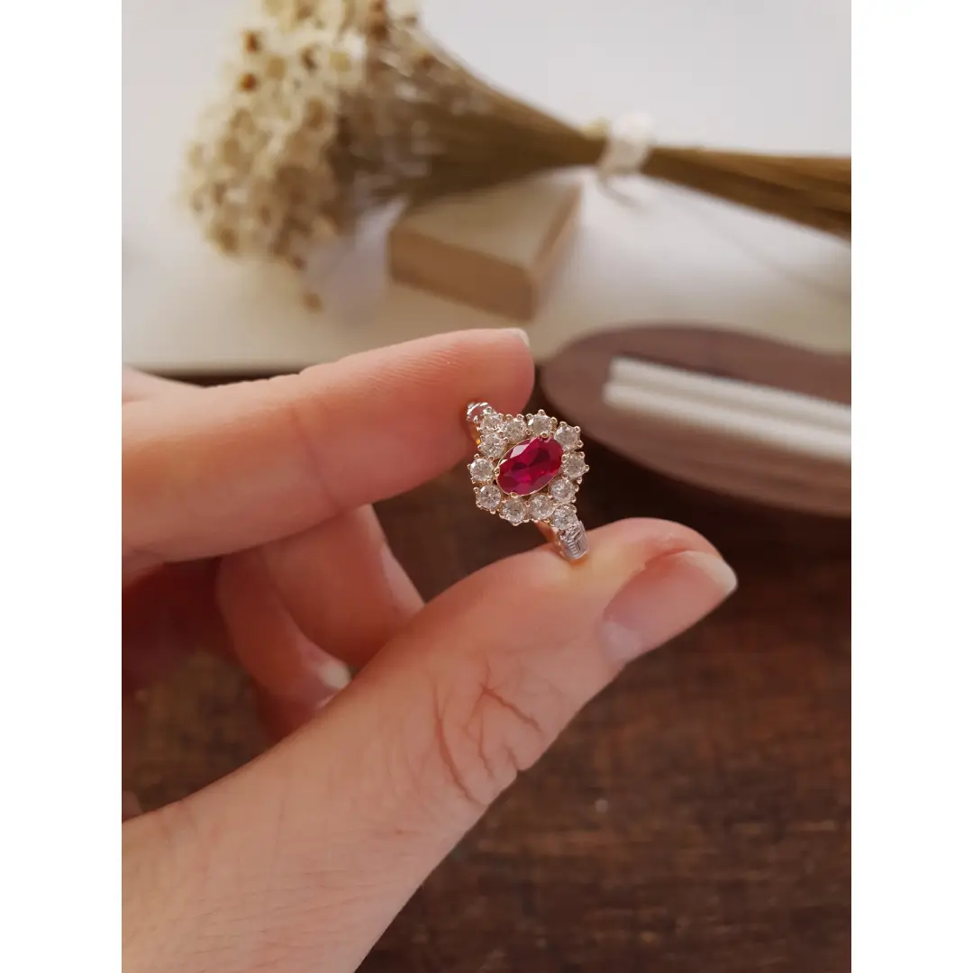 Pedra central: Rubi sintético oval com 4mm por 6mm.