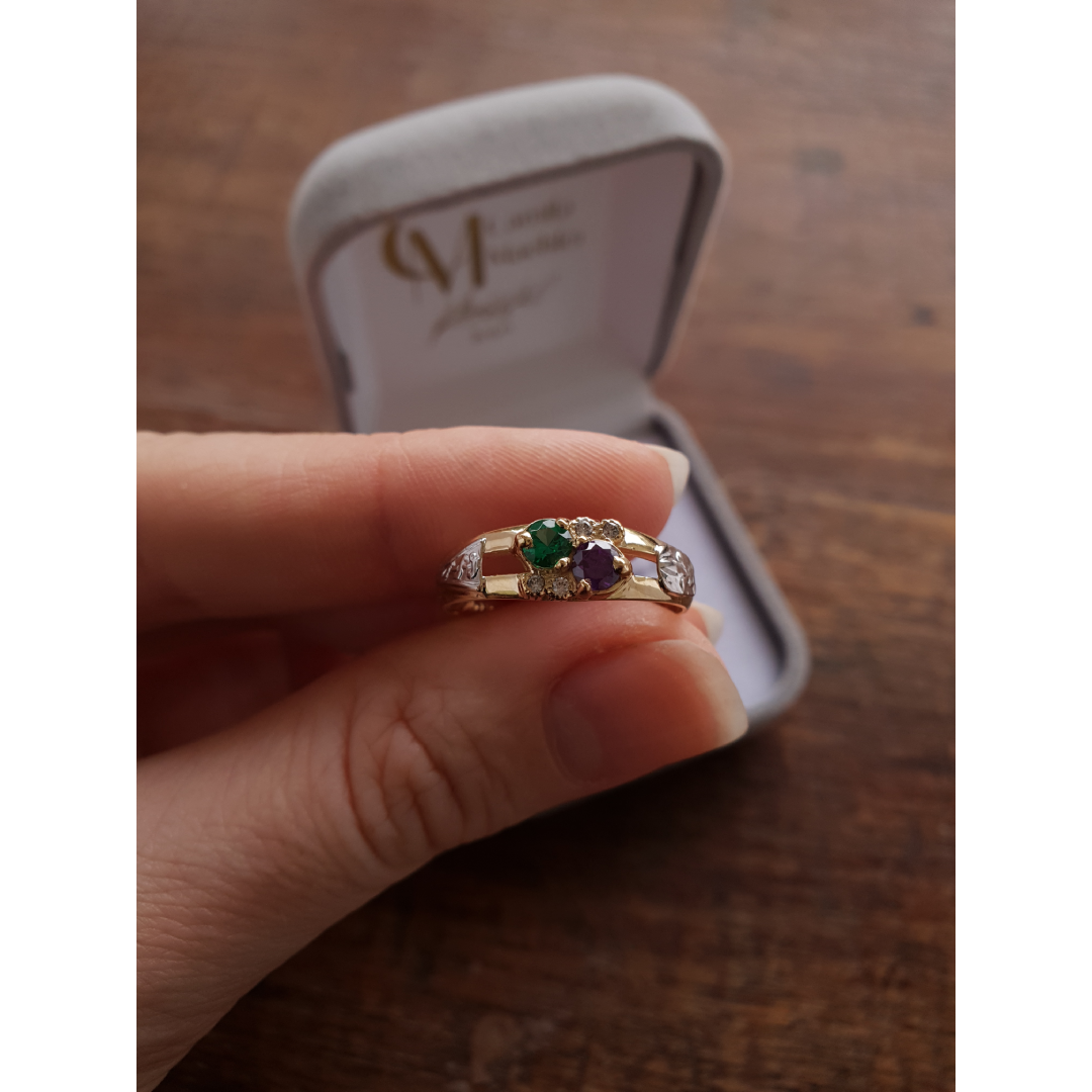 Emblemas do curso em ouro branco maciço e o restante do anel em ouro amarelo maciço.
