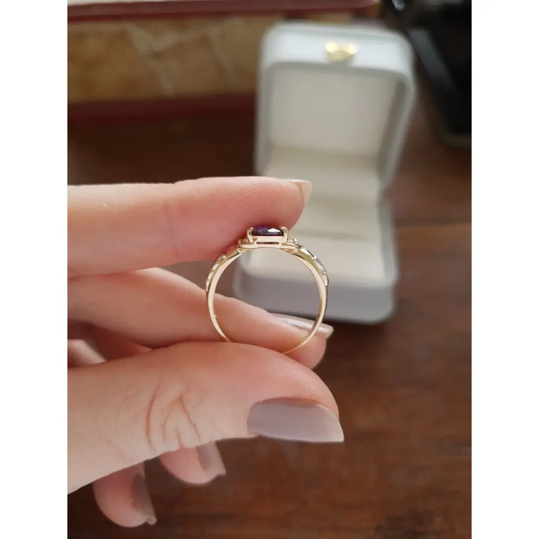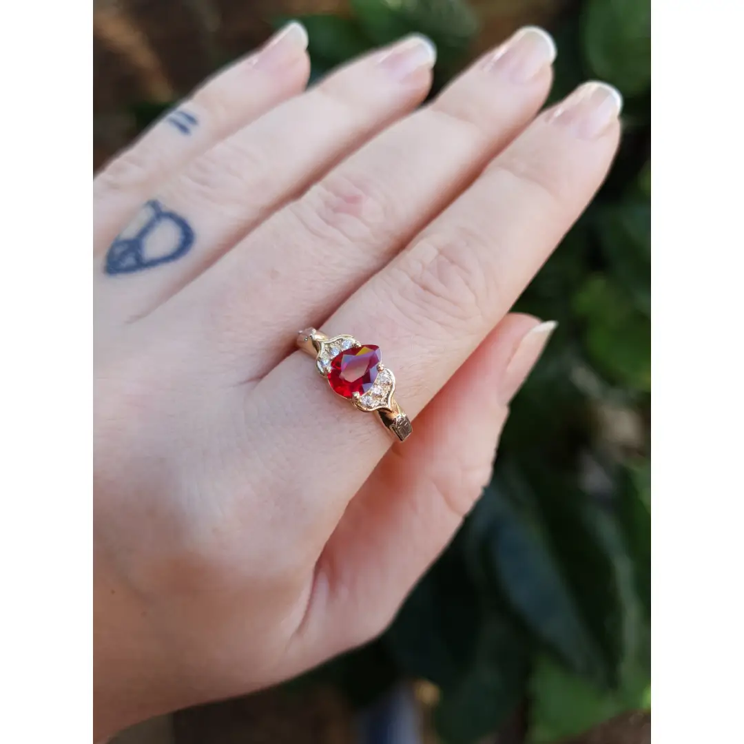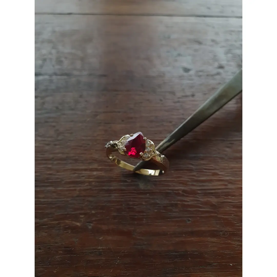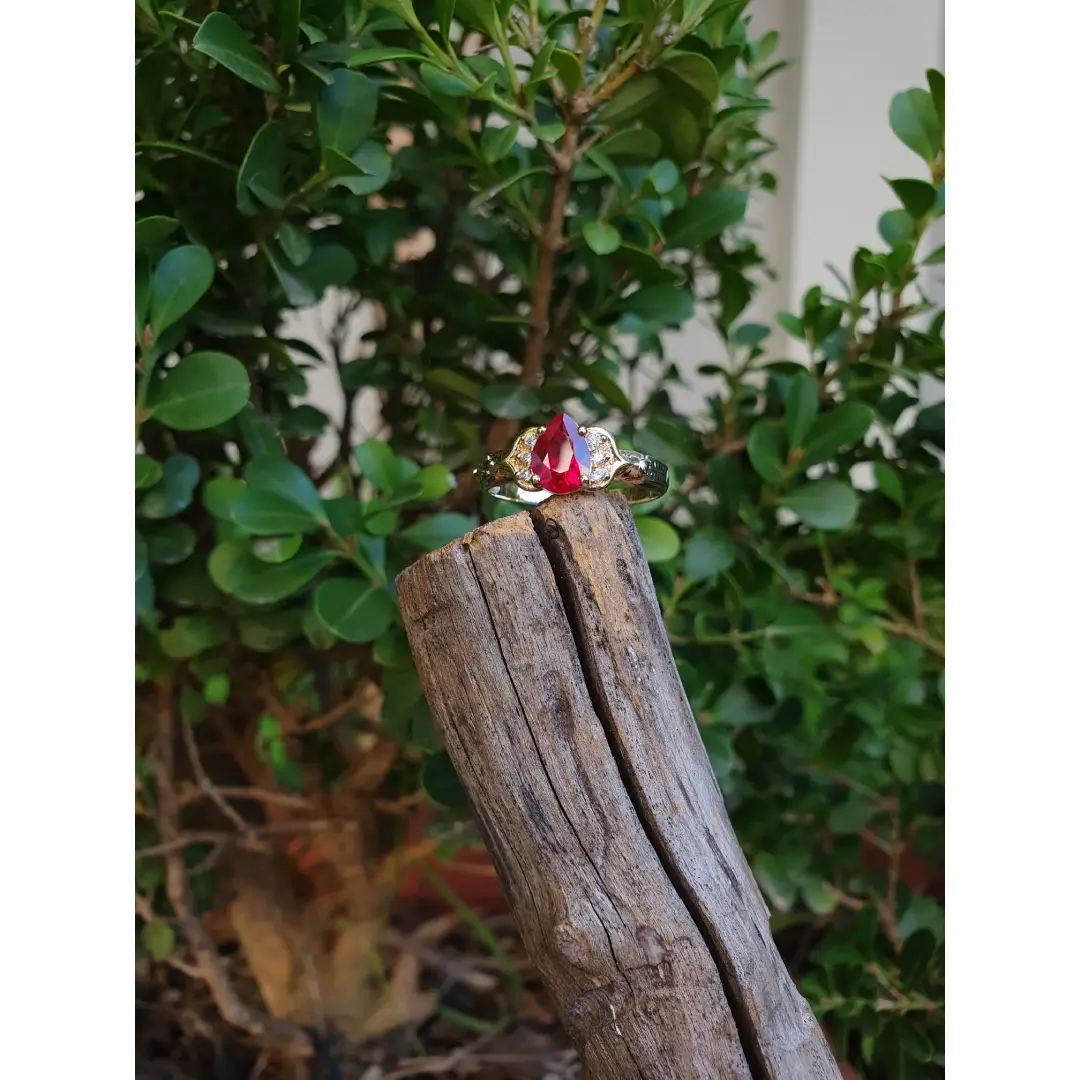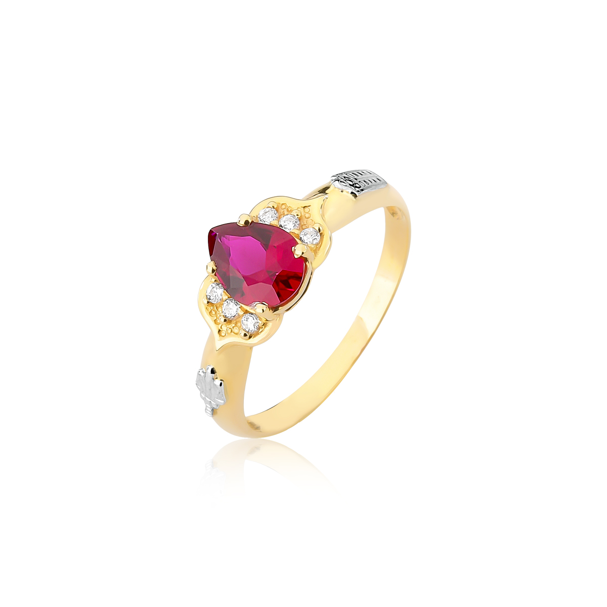 No centro, um rubi sintético em formato de gota (6x8mm) roubado a cena, simbolizando coragem e paixão. E, para fechar com chave de ouro (literalmente!), o anel ainda tem seis zircônias de 1,5mm, ao redor da pedra principal, adicionando aquele toque de glamour que todo formando merece.