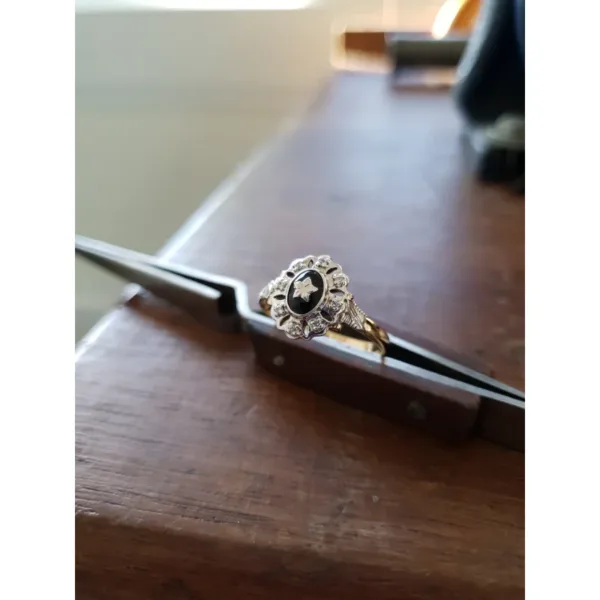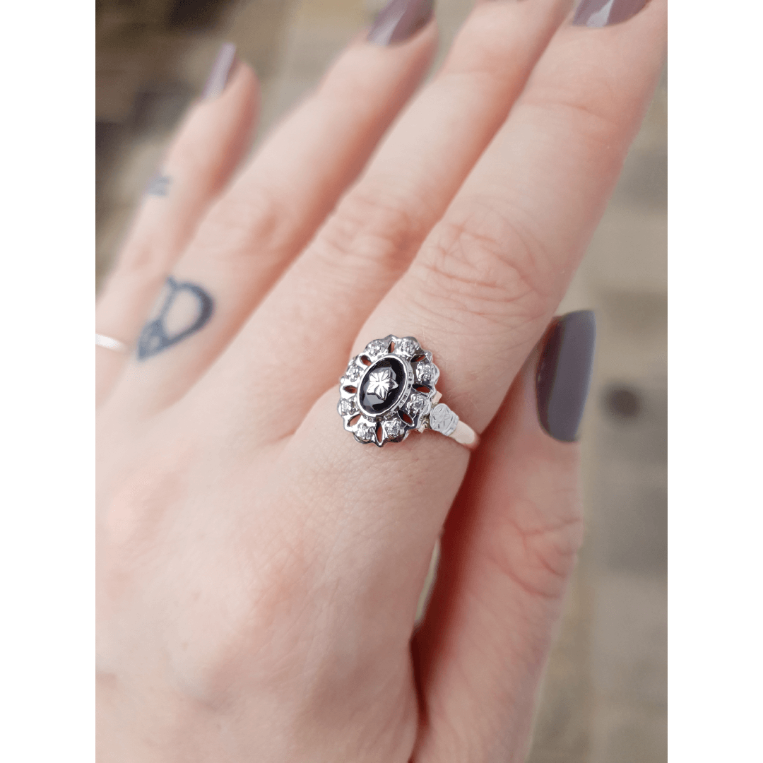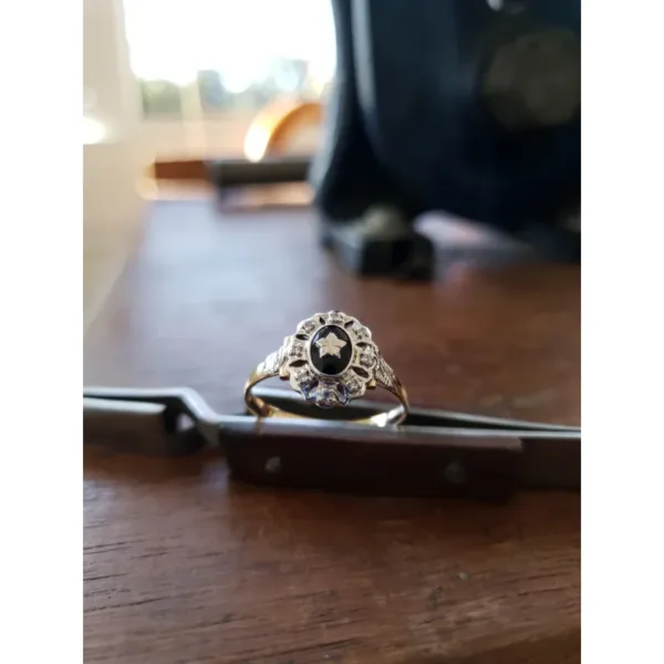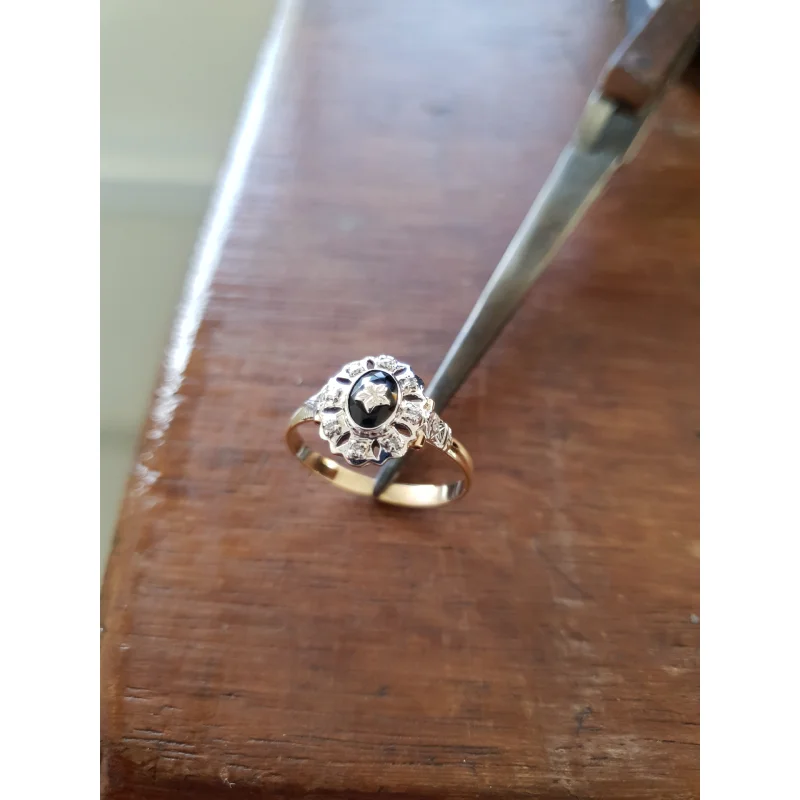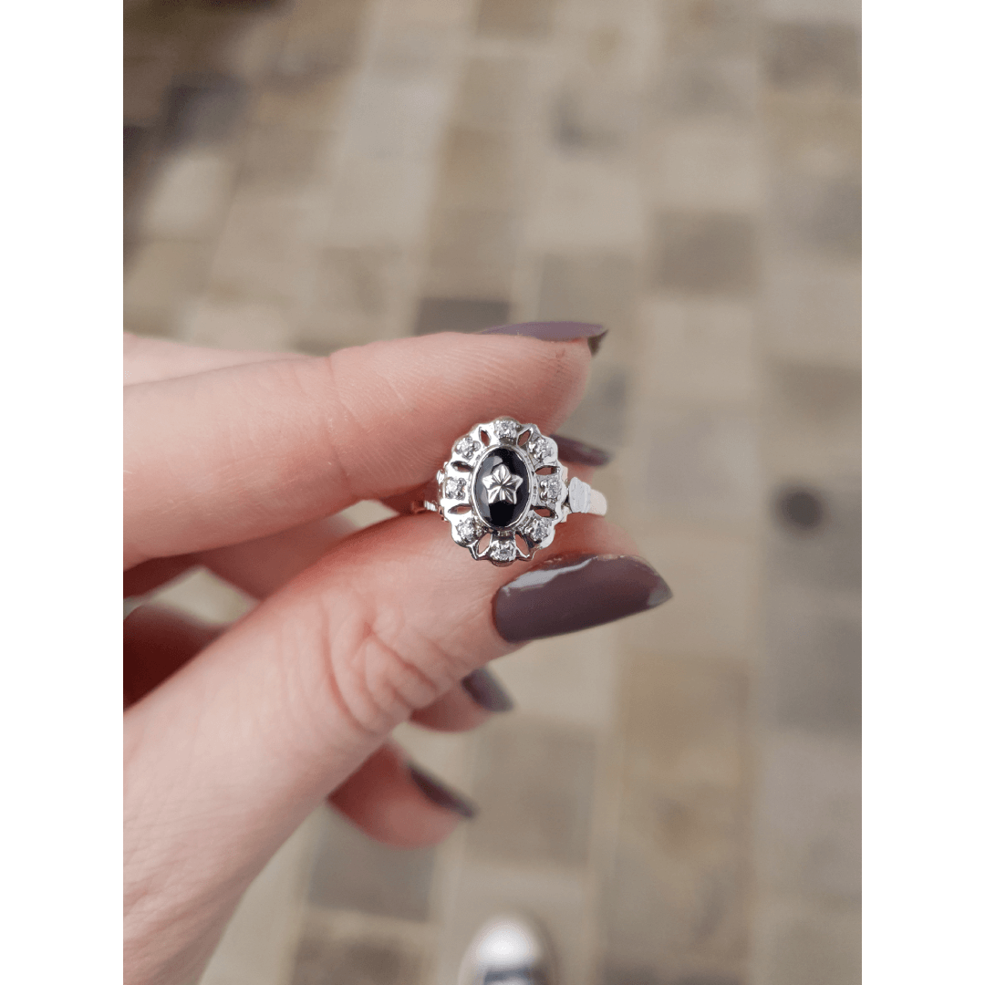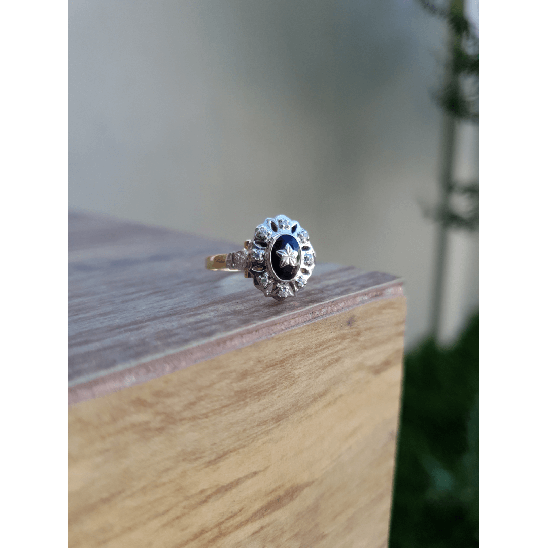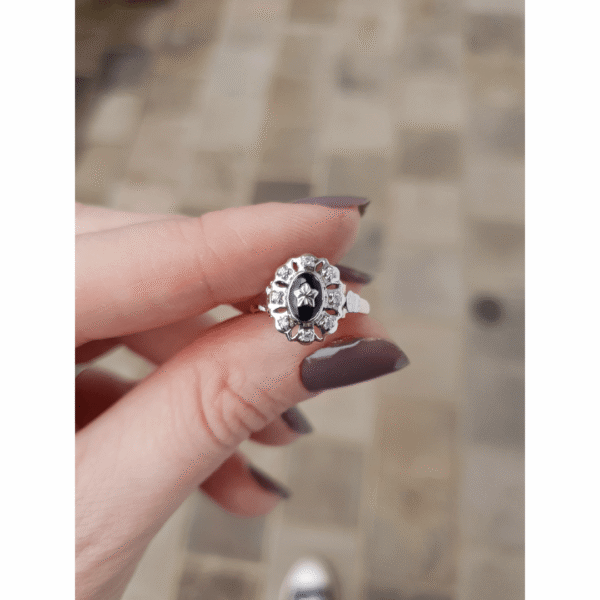 Uma das características marcantes deste anel é sua pedra central de Ônix oval com 5mm por 7mm, adornada com uma estrela em ouro branco. Além disso, conta com oito zircônias externas de 1,25mm, que adicionam um toque de brilho e elegância à peça. Trabalhamos apenas com pedras naturais da mais alta qualidade, garantindo que sua joia seja verdadeiramente especial.