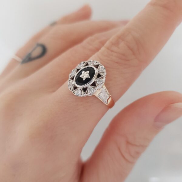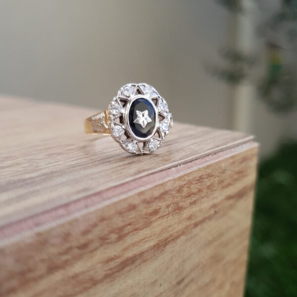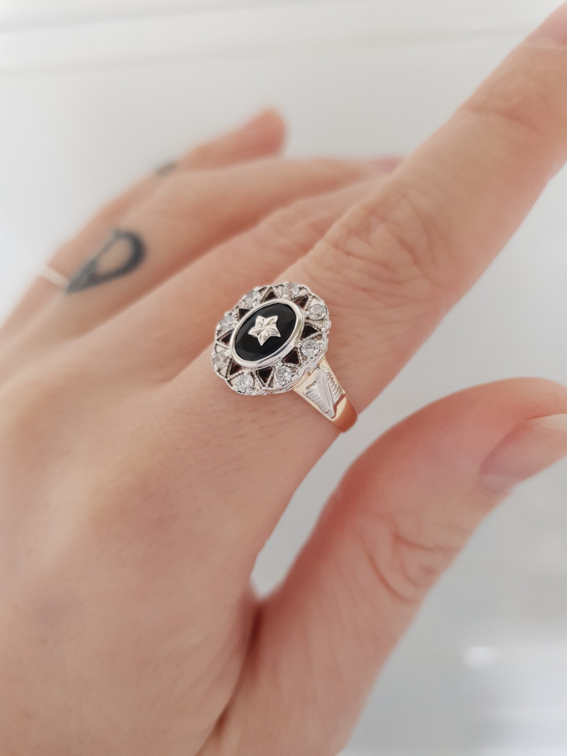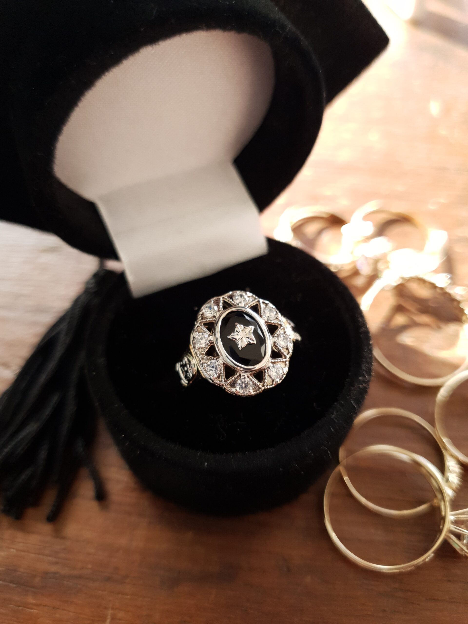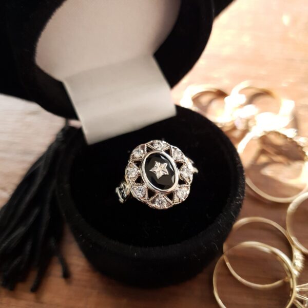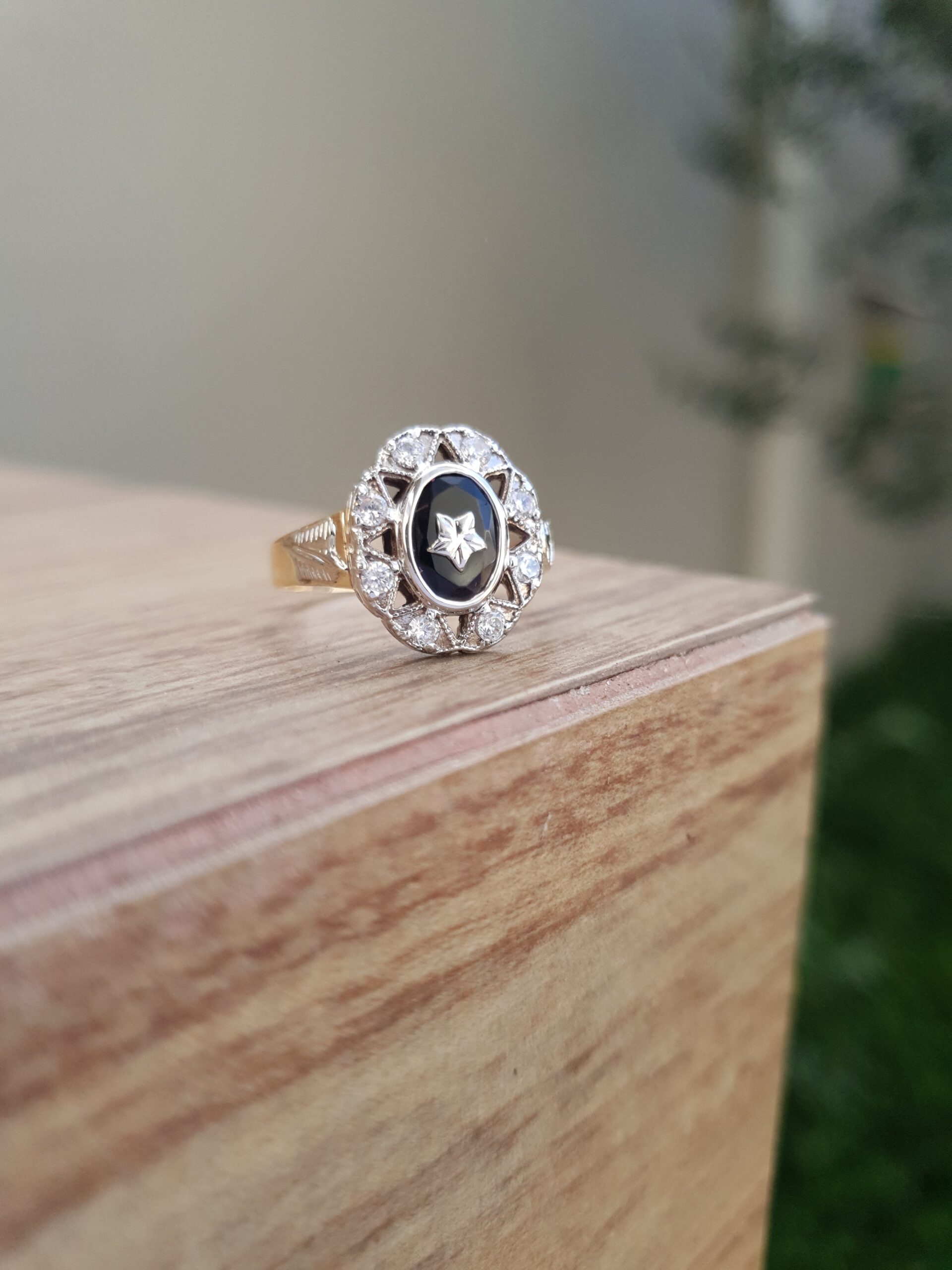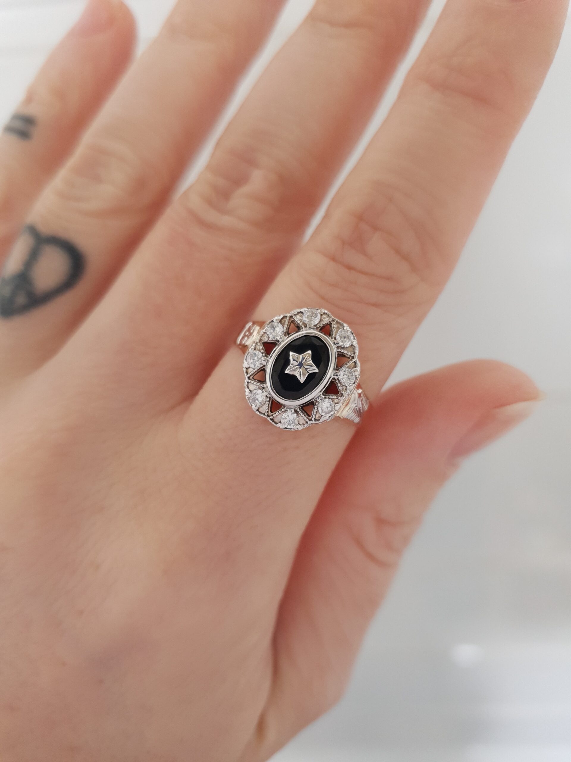 Pedra central: Ônix oval com 7mm por 9mm e estrela em ouro branco.