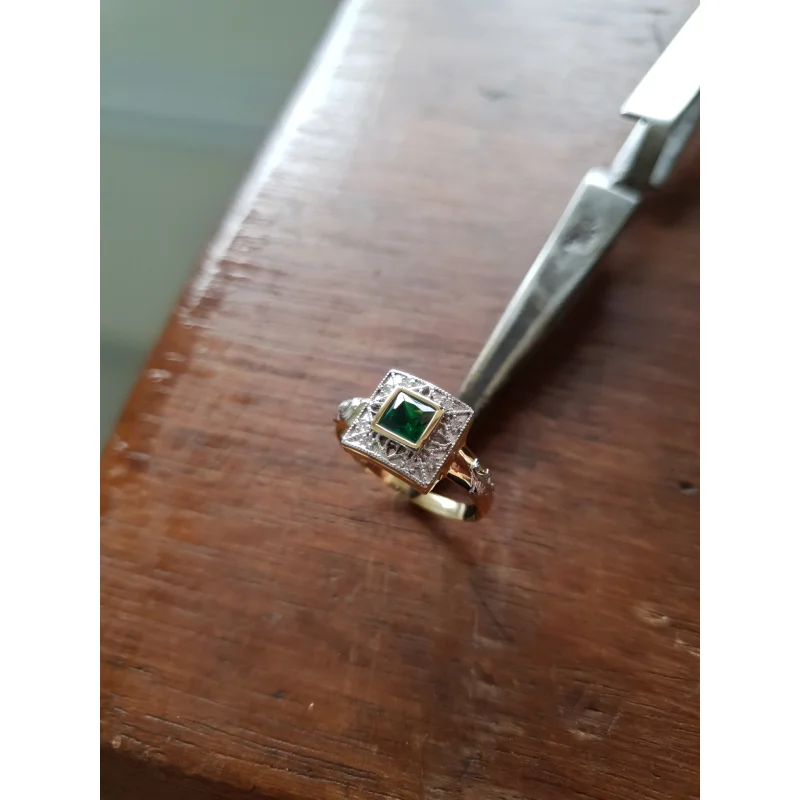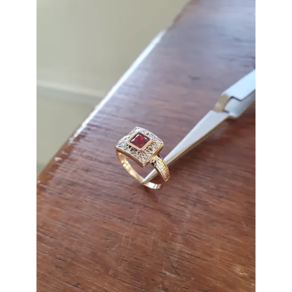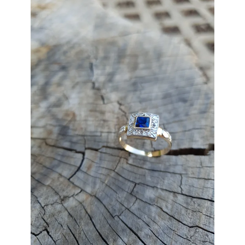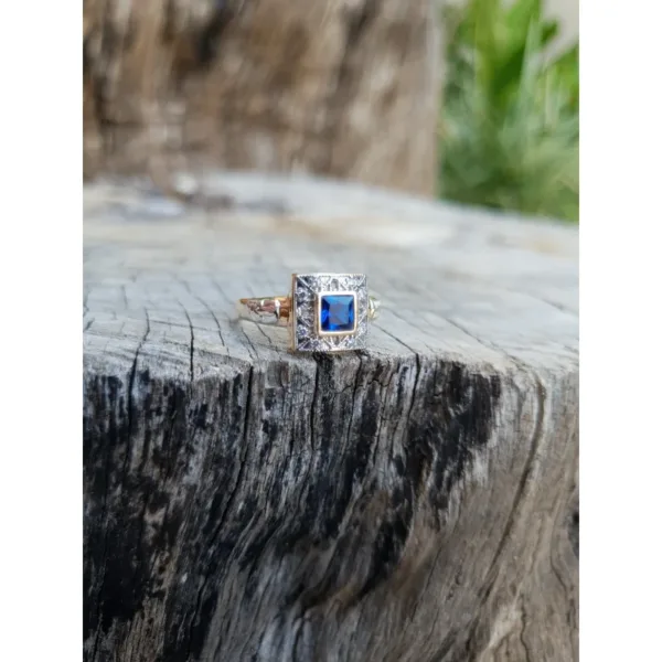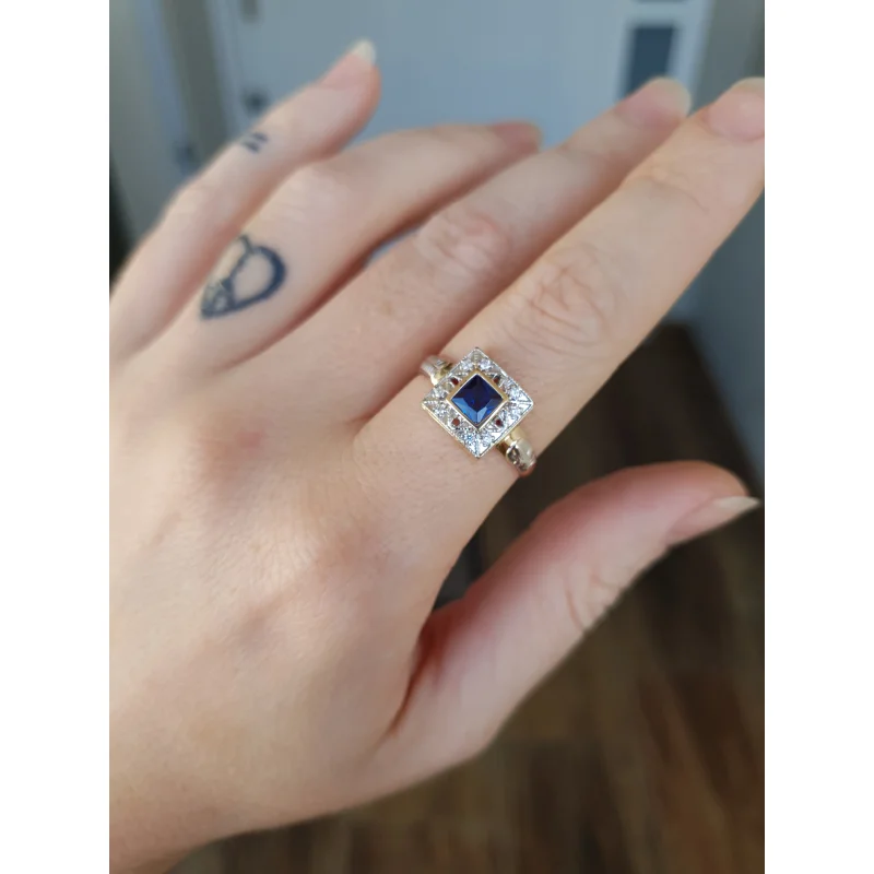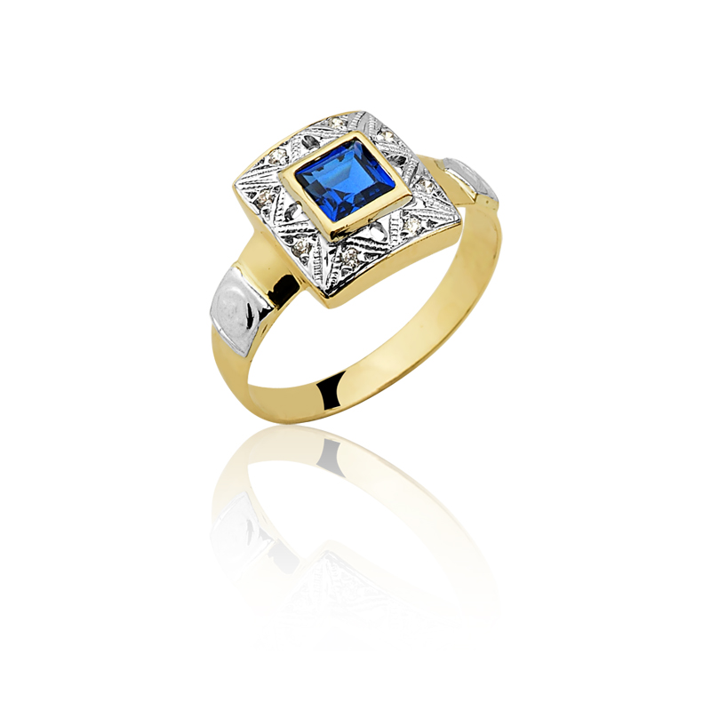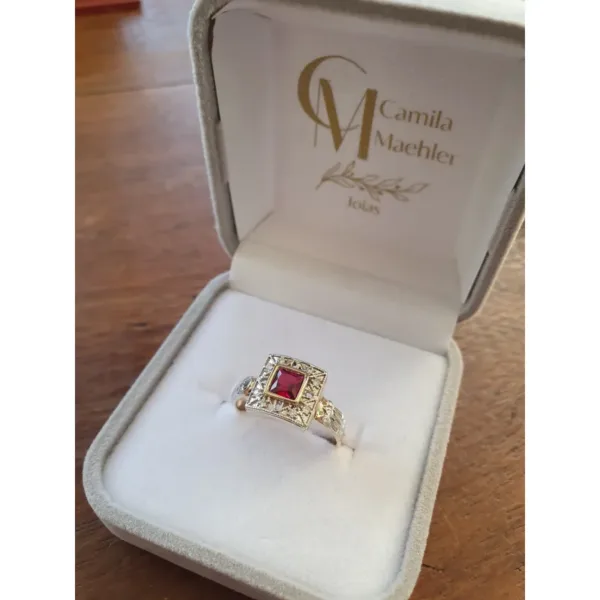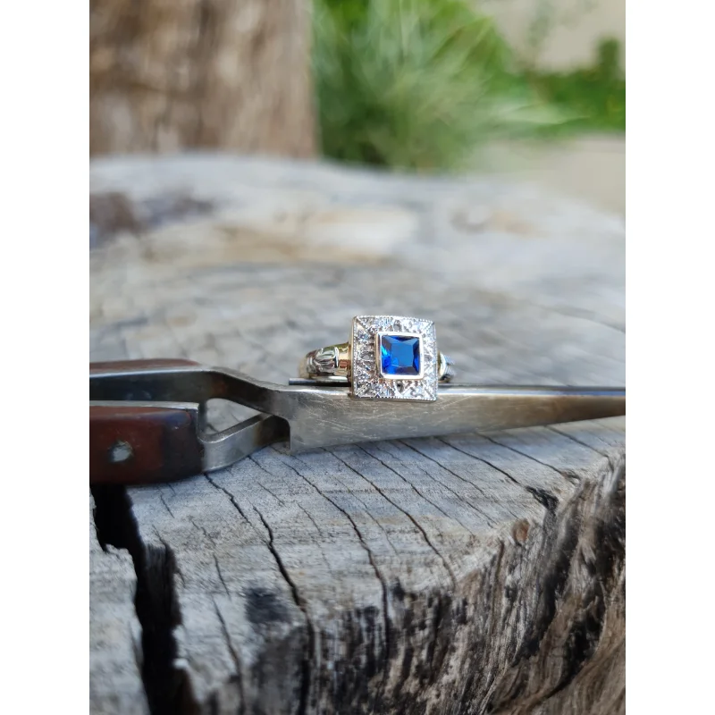 Pedra central: Safira Azul sintética (carré) com 5mm por 5mm.
