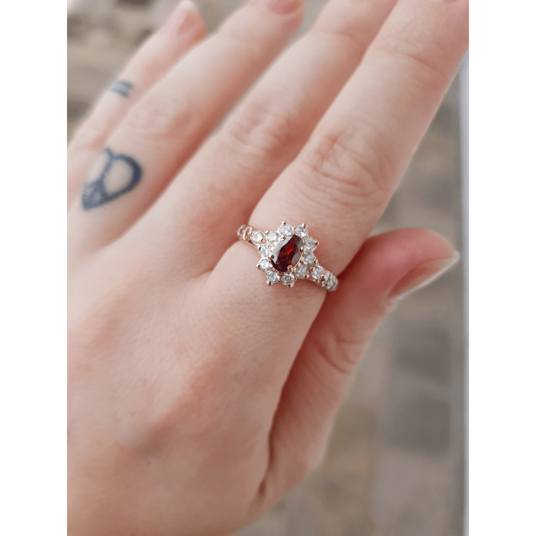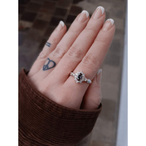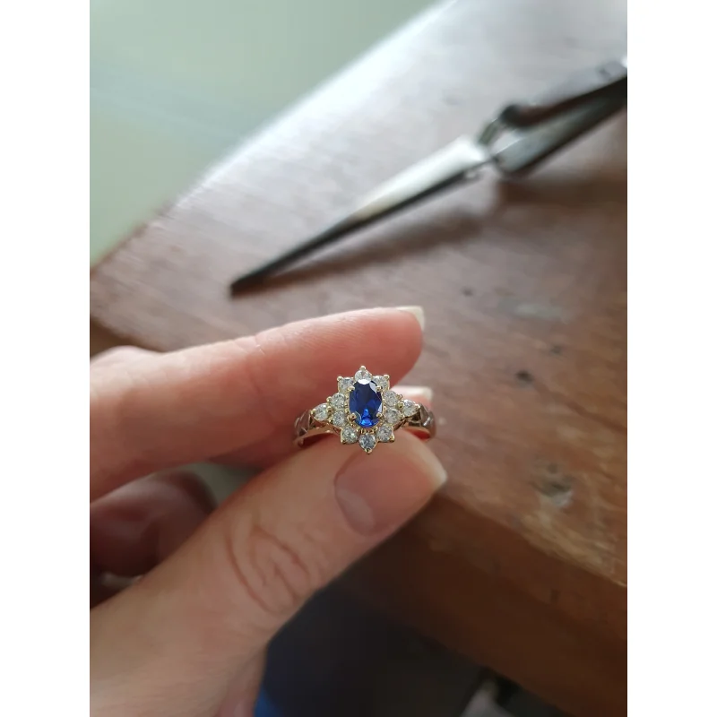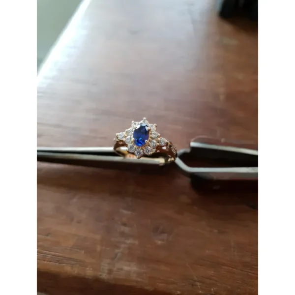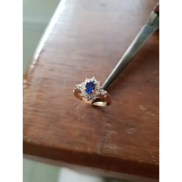 Pedra central: Safira Azul sintética oval com 4mm por 6mm.