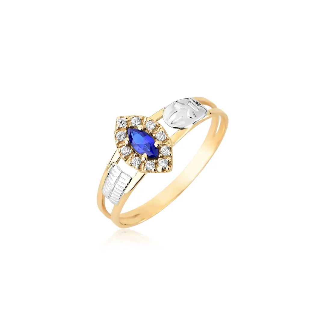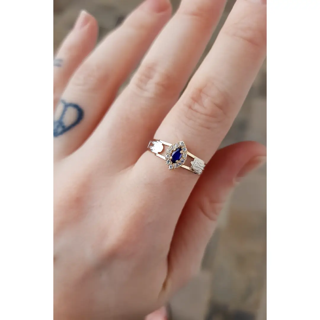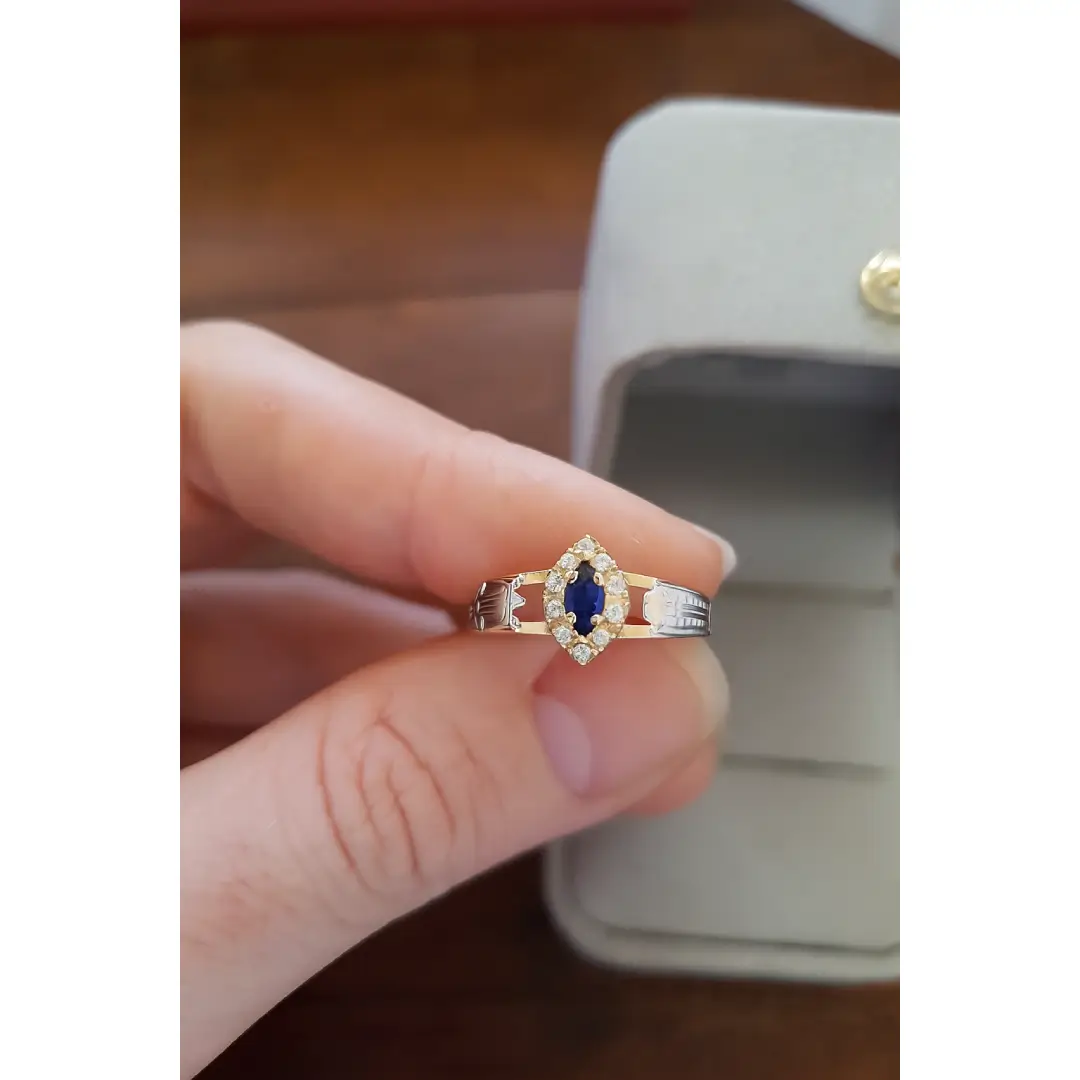 Pedra central: Safira Azul sintética (navete) com 2,5mm por 5mm.