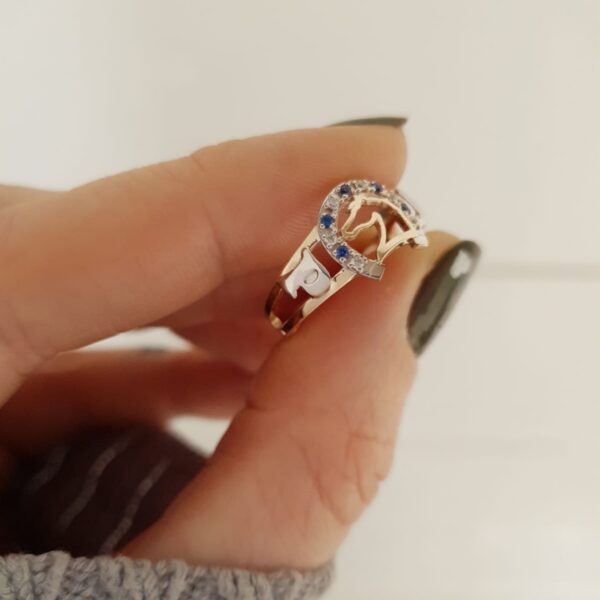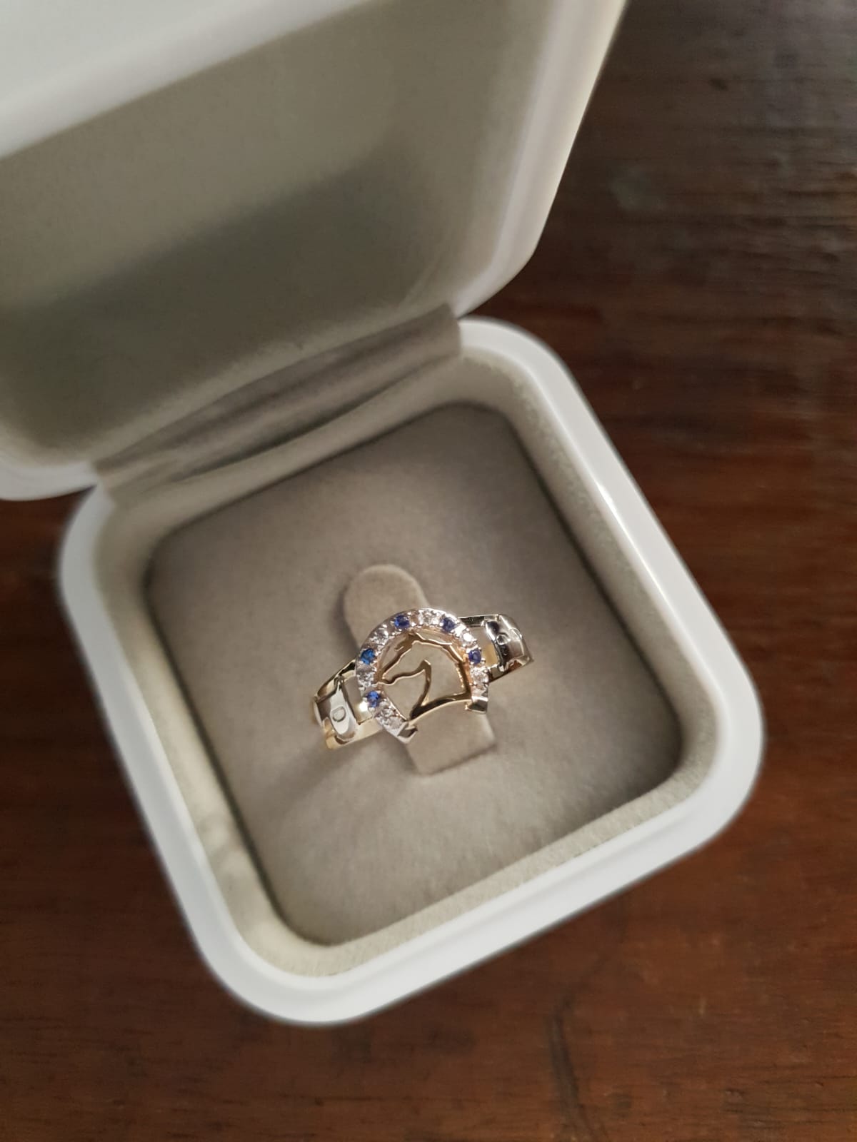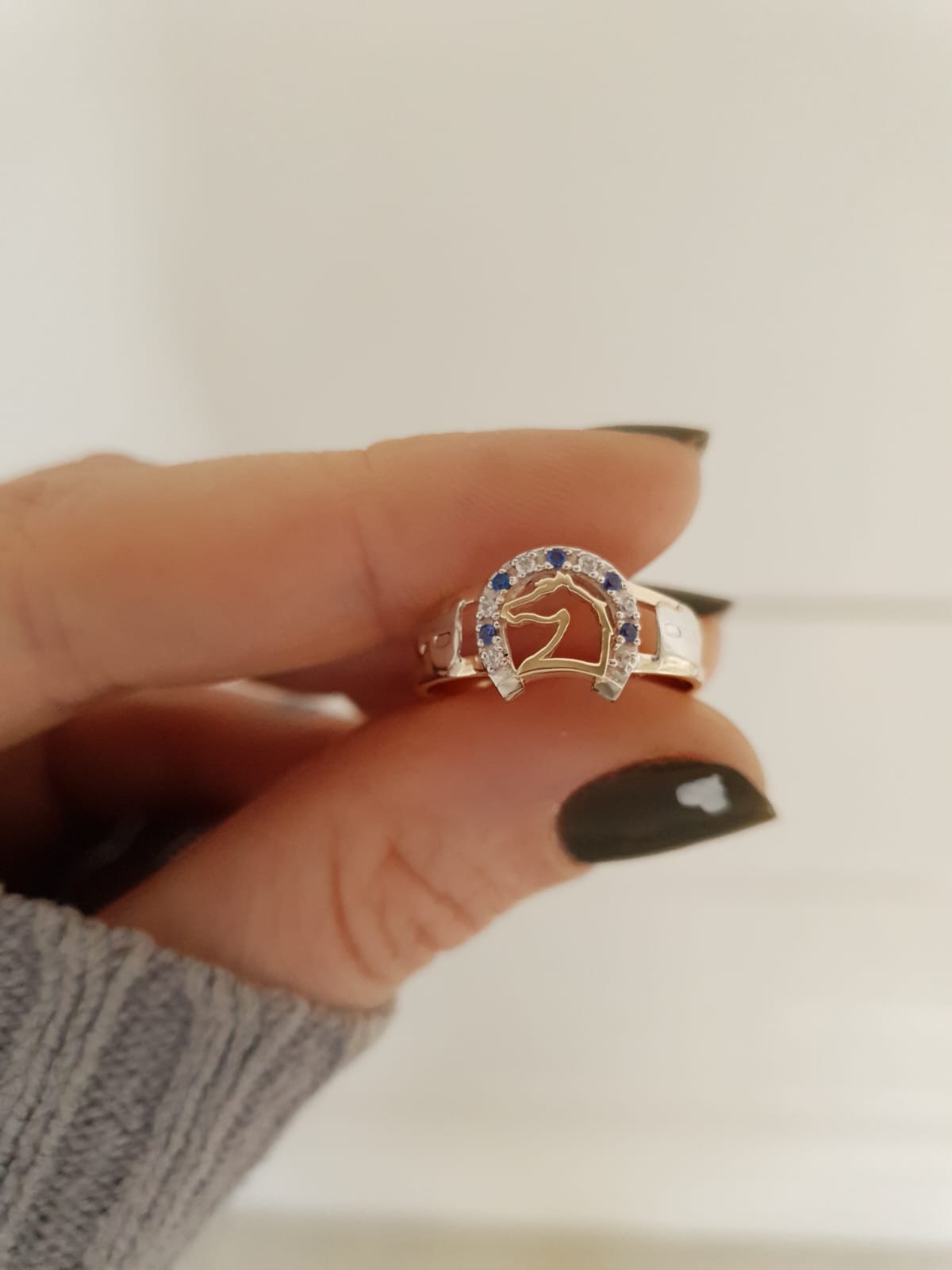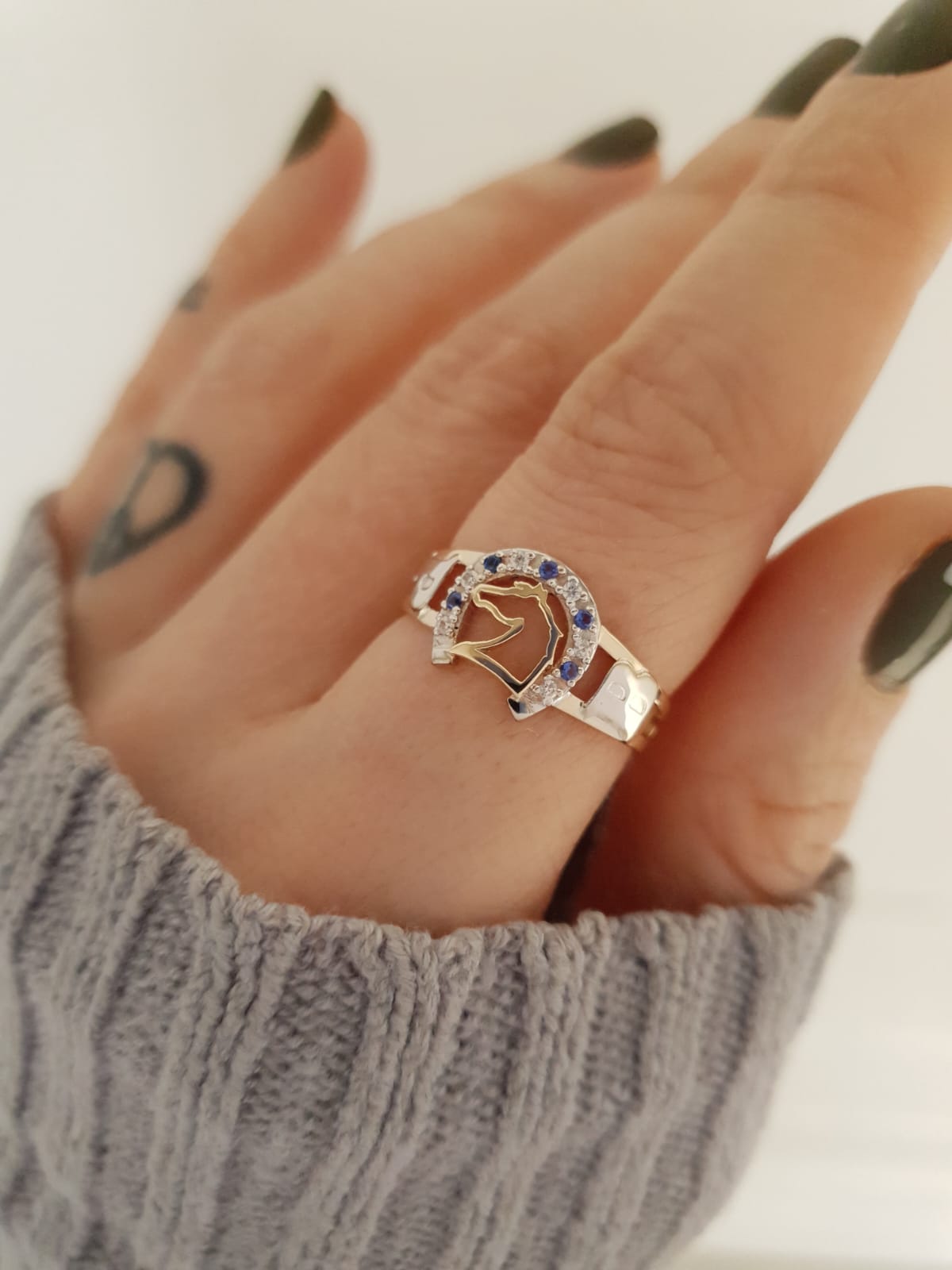 Anel ferradura e cabeça de cavalo em ouro maciço