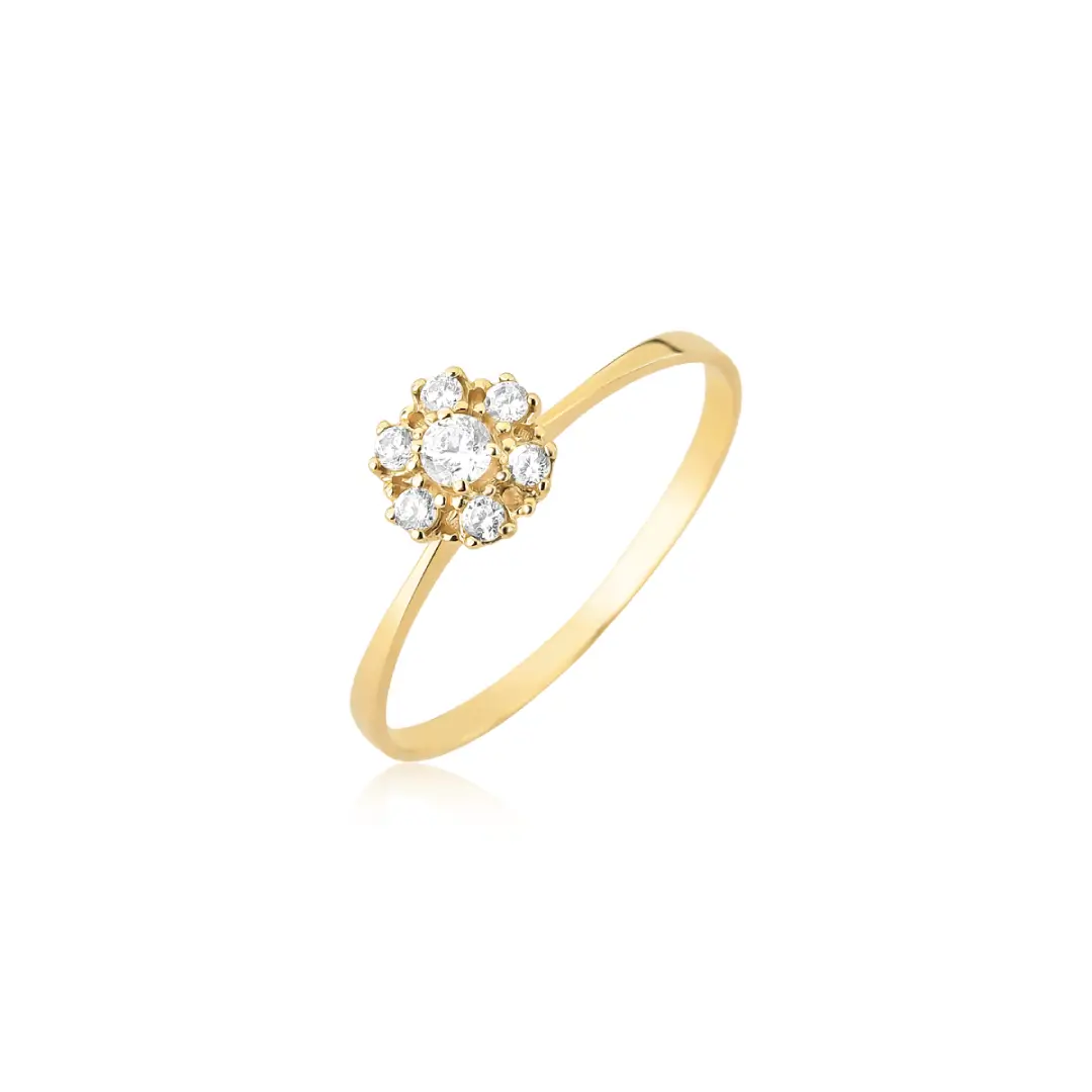 Com um aro de 1,55mm de diâmetro, ele oferece um ajuste confortável e seguro para quem o usa. Sua pedra central de 2,5mm adiciona um toque de brilho sutil, enquanto as seis zircônias externas de 1,5mm cada acrescentam um charme adicional à peça. Esses detalhes encantadores o tornam uma escolha versátil, adequada para uma variedade de ocasiões, desde noivados até festas de 15 anos, ou até mesmo para uso diário como aparador de aliança ou solitário.