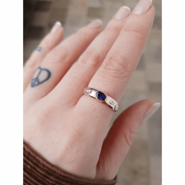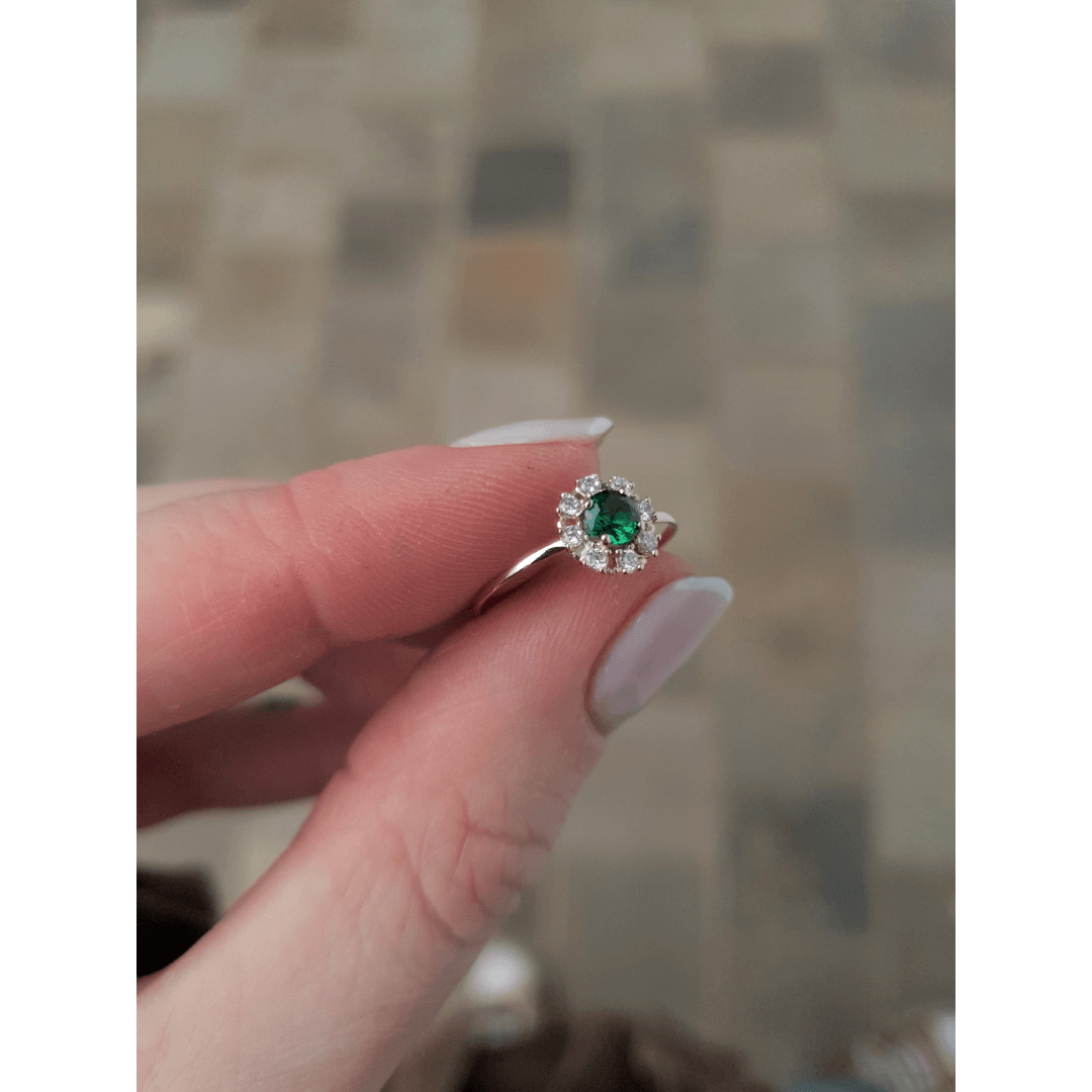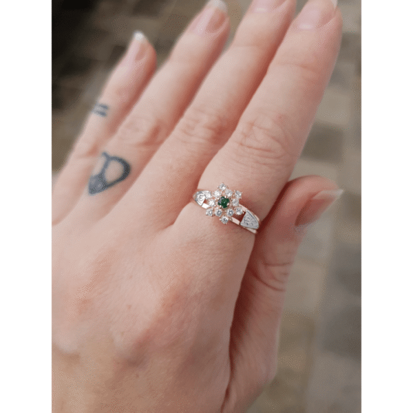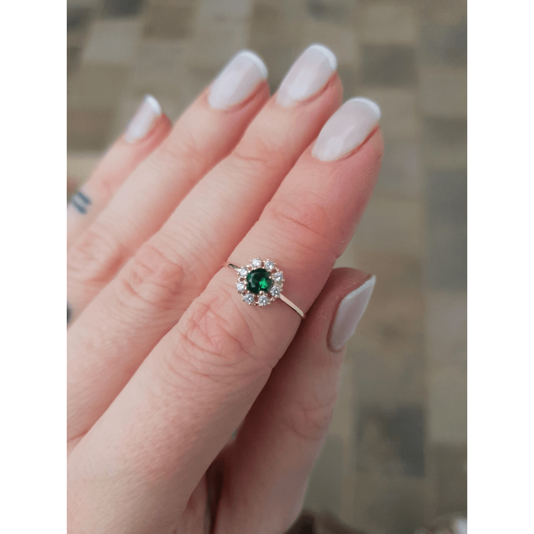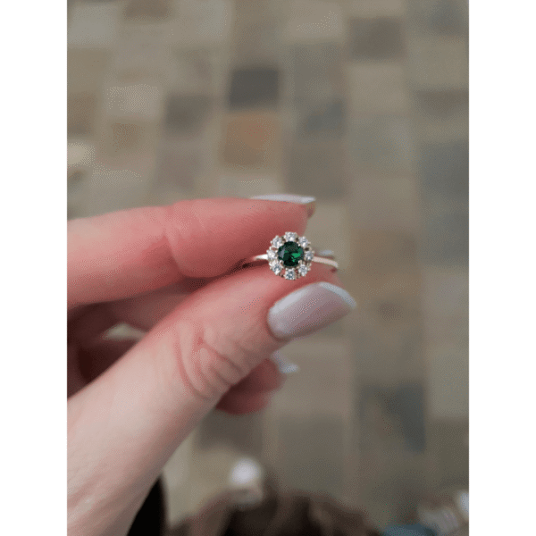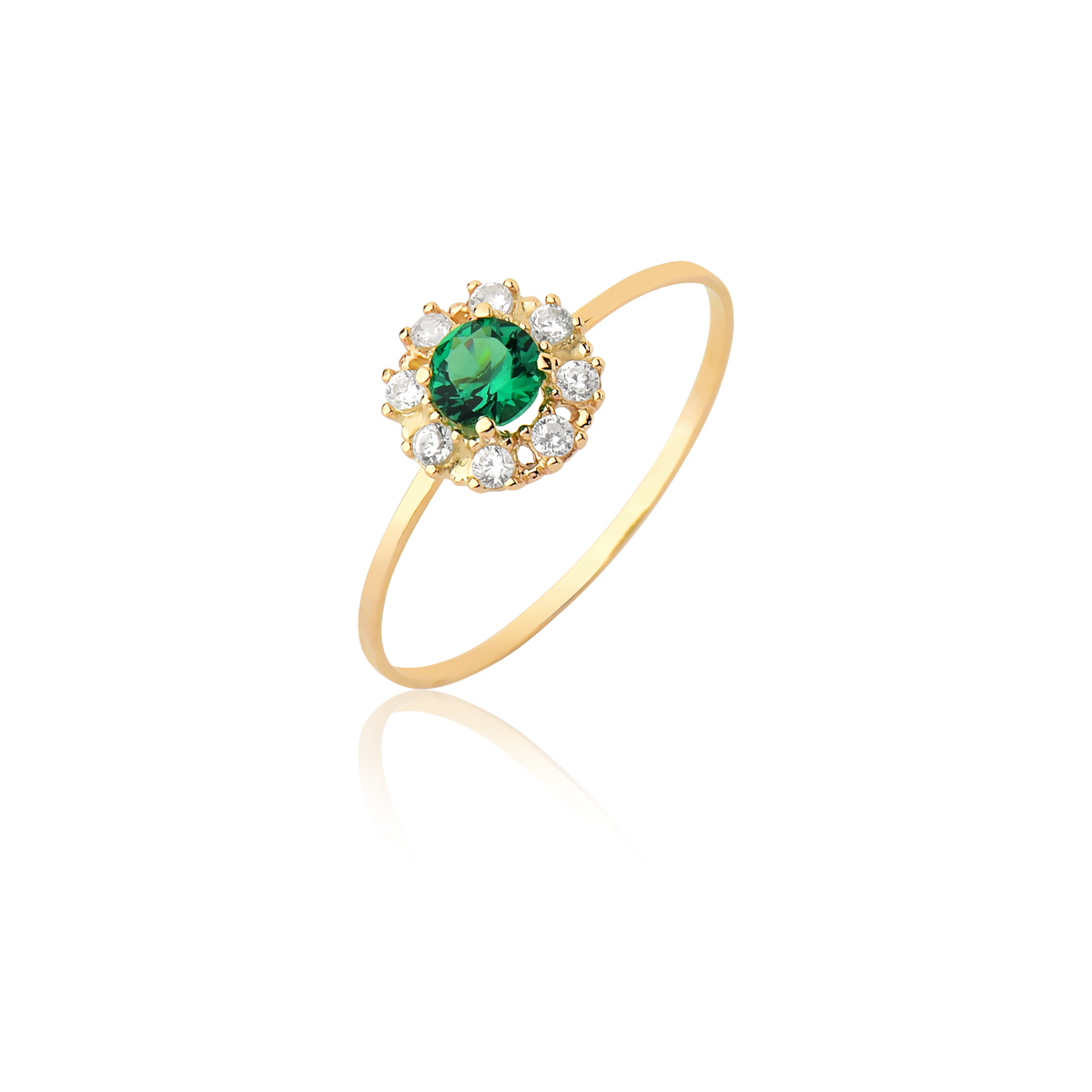Ela apresenta um aro delicado de 0,95mm, o que lhe confere conforto. A pedra central é uma Pedra Verde Esmeralda de 4mm redonda, cercada por 8 zircônias brancas de 1,5mm, que adicionam um toque de brilho e luxo. Cada detalhe foi cuidadosamente planejado para criar uma peça que exala elegância e beleza atemporal.