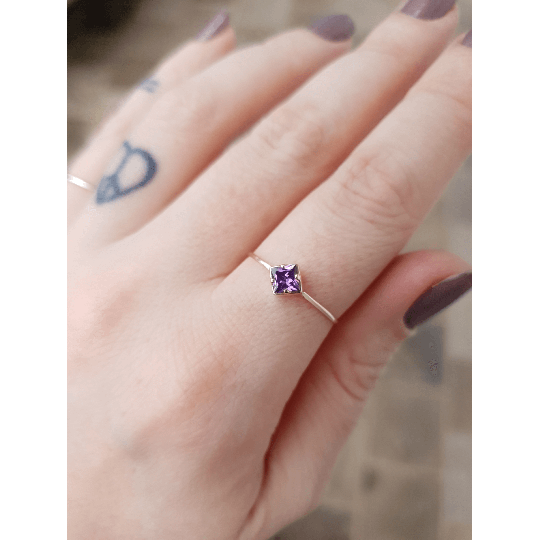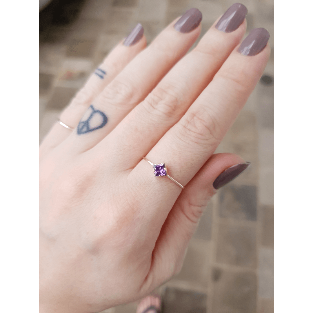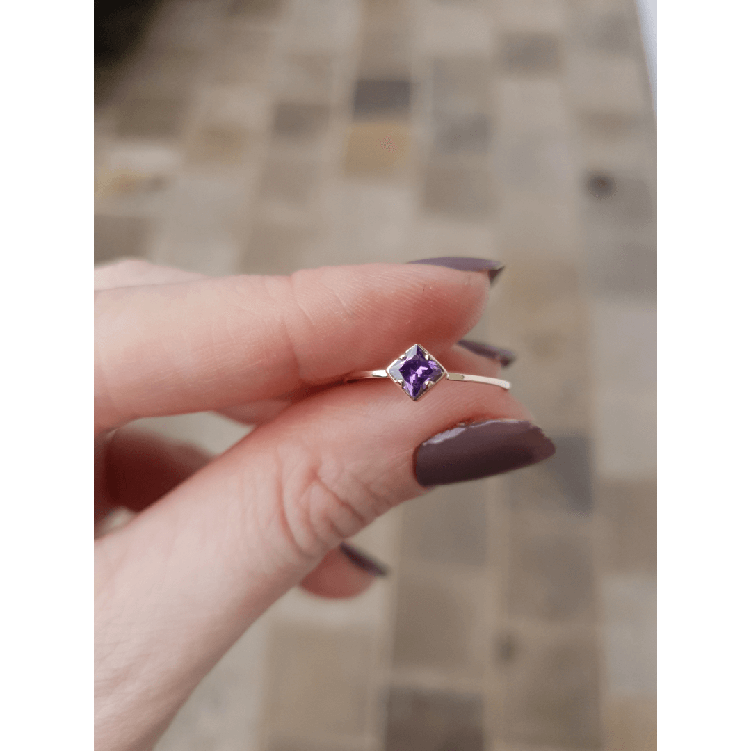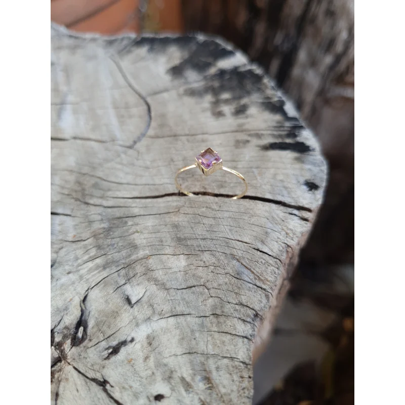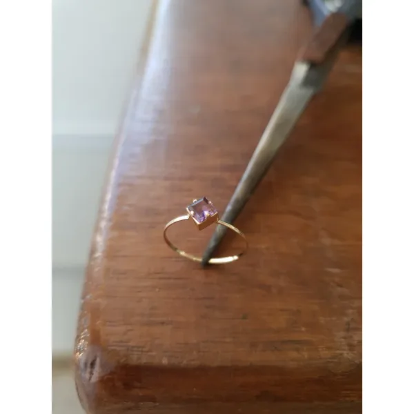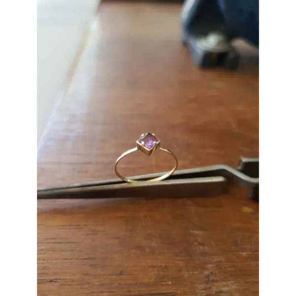 Anel em ouro com uma pedra quadrada lilás