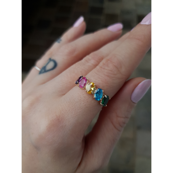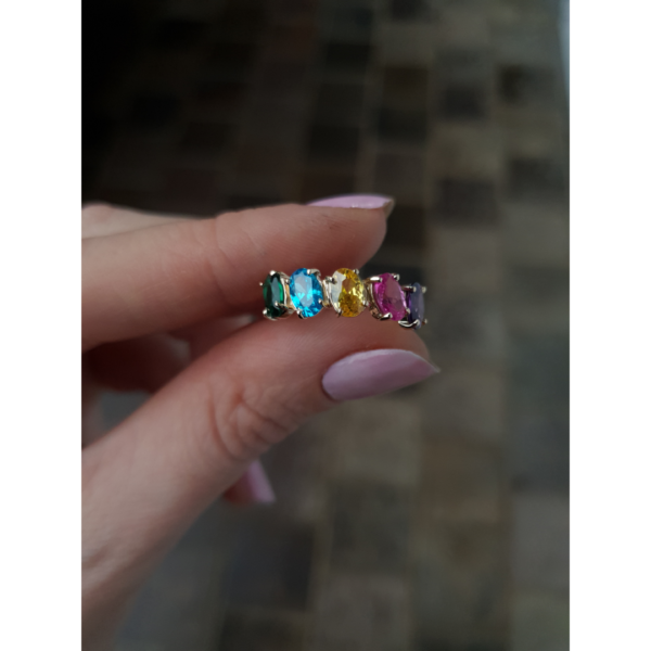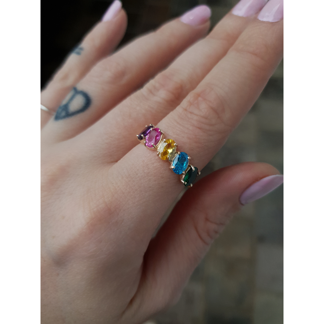 O grande diferencial do Anel Vibração é a possibilidade de personalização. Além de contar com cinco zircônias de 4×6 mm, que proporcionam um brilho especial e toques de cor vibrantes, você pode escolher as cores das pedras e suas posições. Isso significa que cada Anel Vibração pode ser adaptado ao estilo pessoal de quem o usa, criando uma peça única e exclusiva.