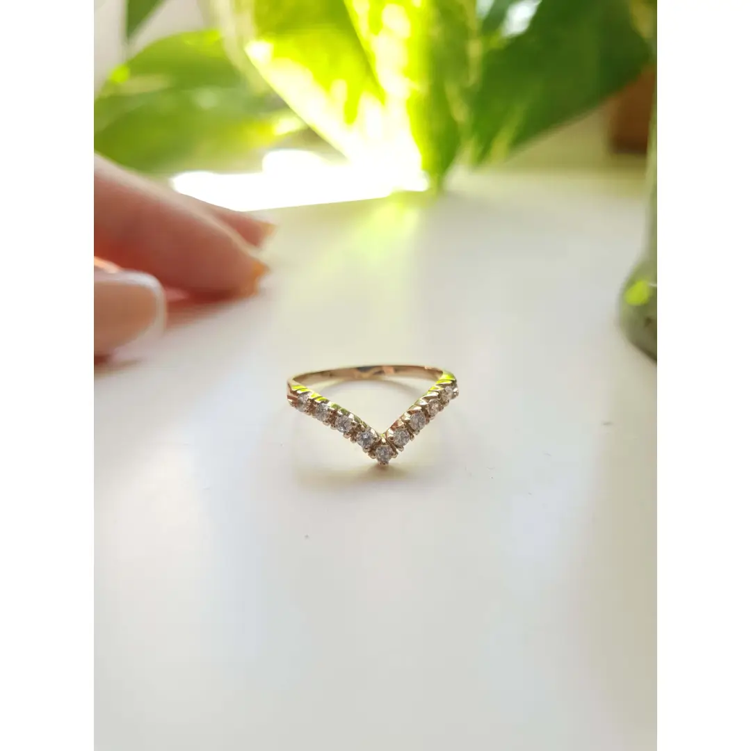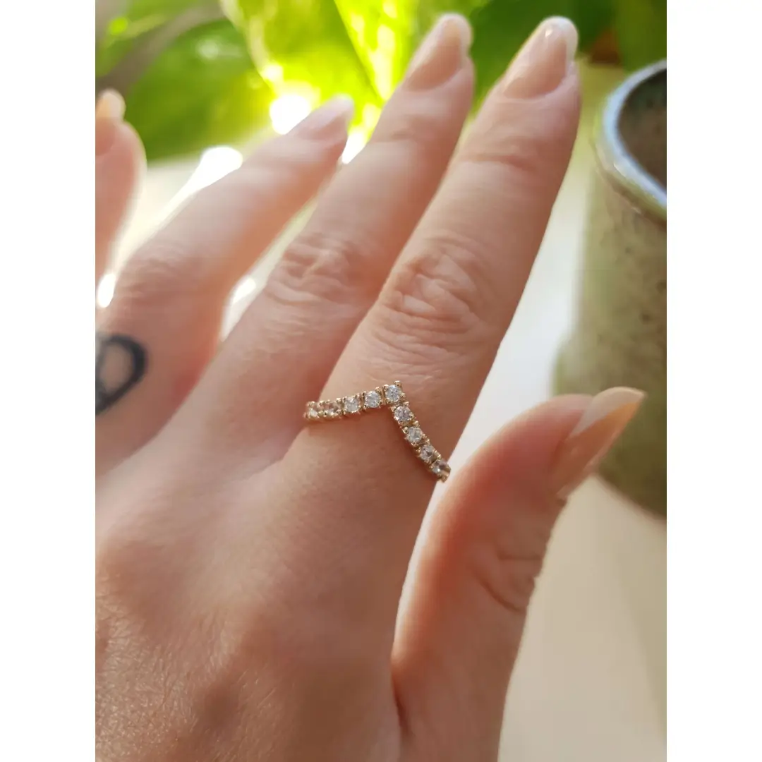 Uma das coisas que mais encanta nessa joia são as pedras. A Meia Aliança em V C1002 vem com 9 zircônias de 2mm.