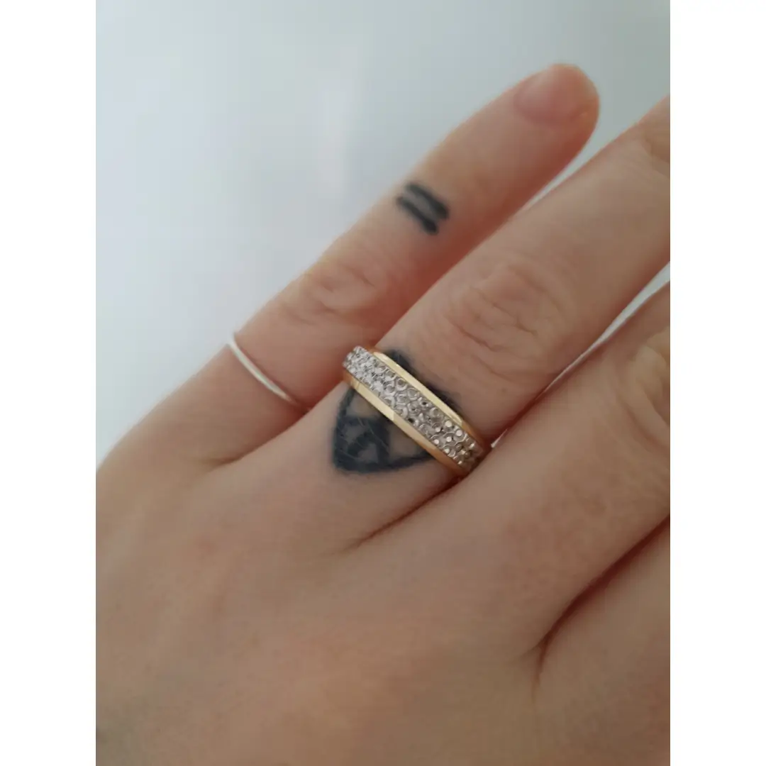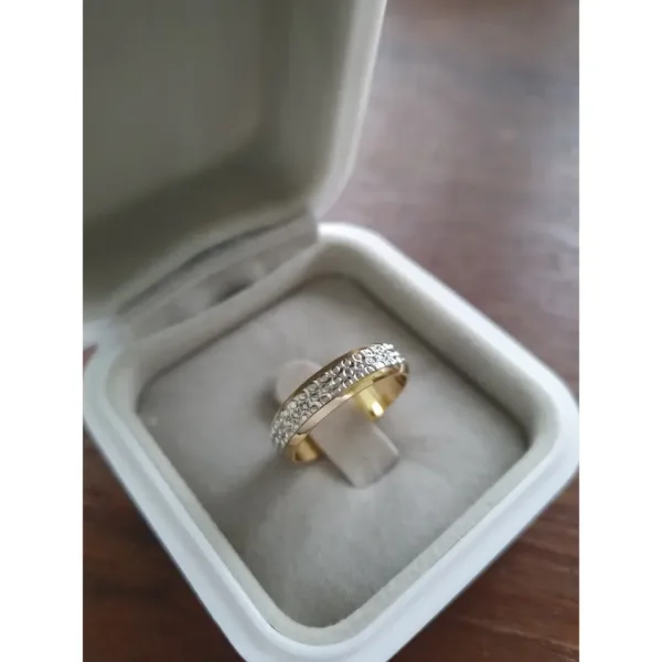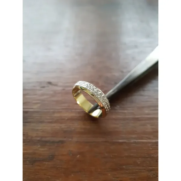 Aliança diamantada em ouro amarelo e branco CN43, disponível nas opções 10K e 18K.