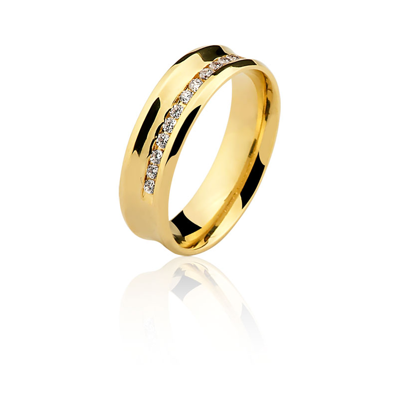 Aliança anatômica em ouro amarelo CN66, disponível nas opções 10K e 18K.